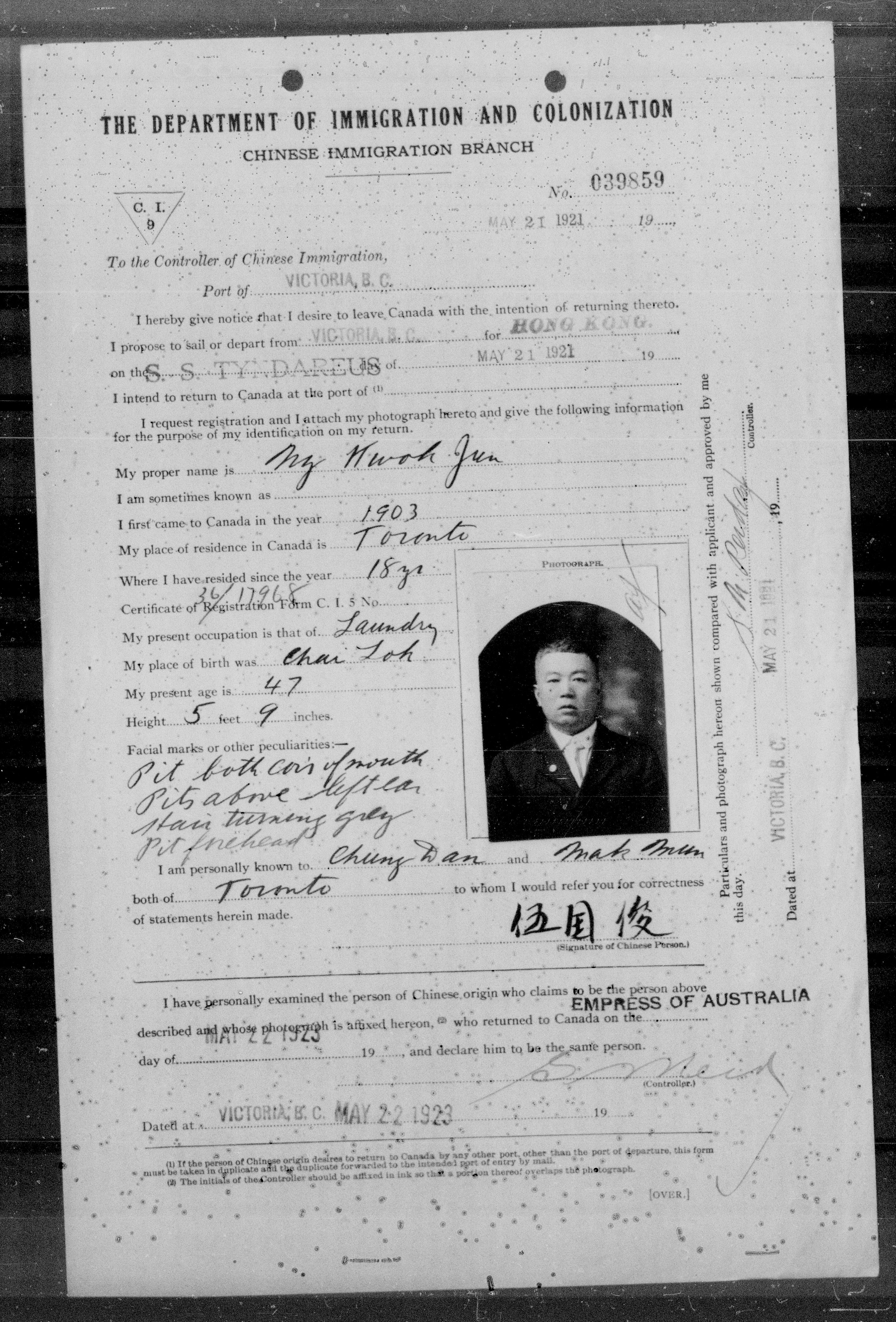 Chinese immigration records : C.I.9 certificates from Vancouver and Victoria