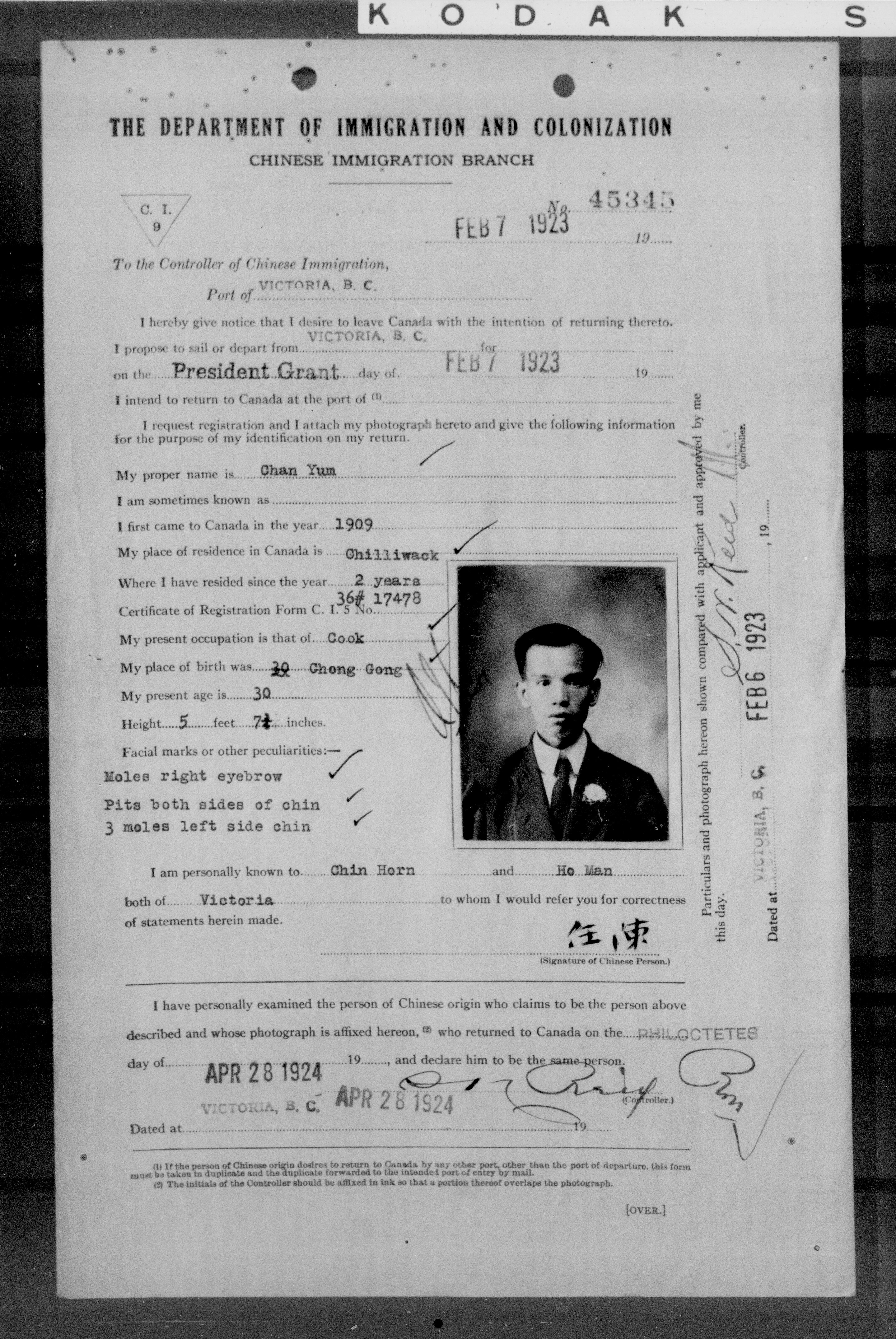 Chinese immigration records : C.I.9 certificates from Vancouver and Victoria