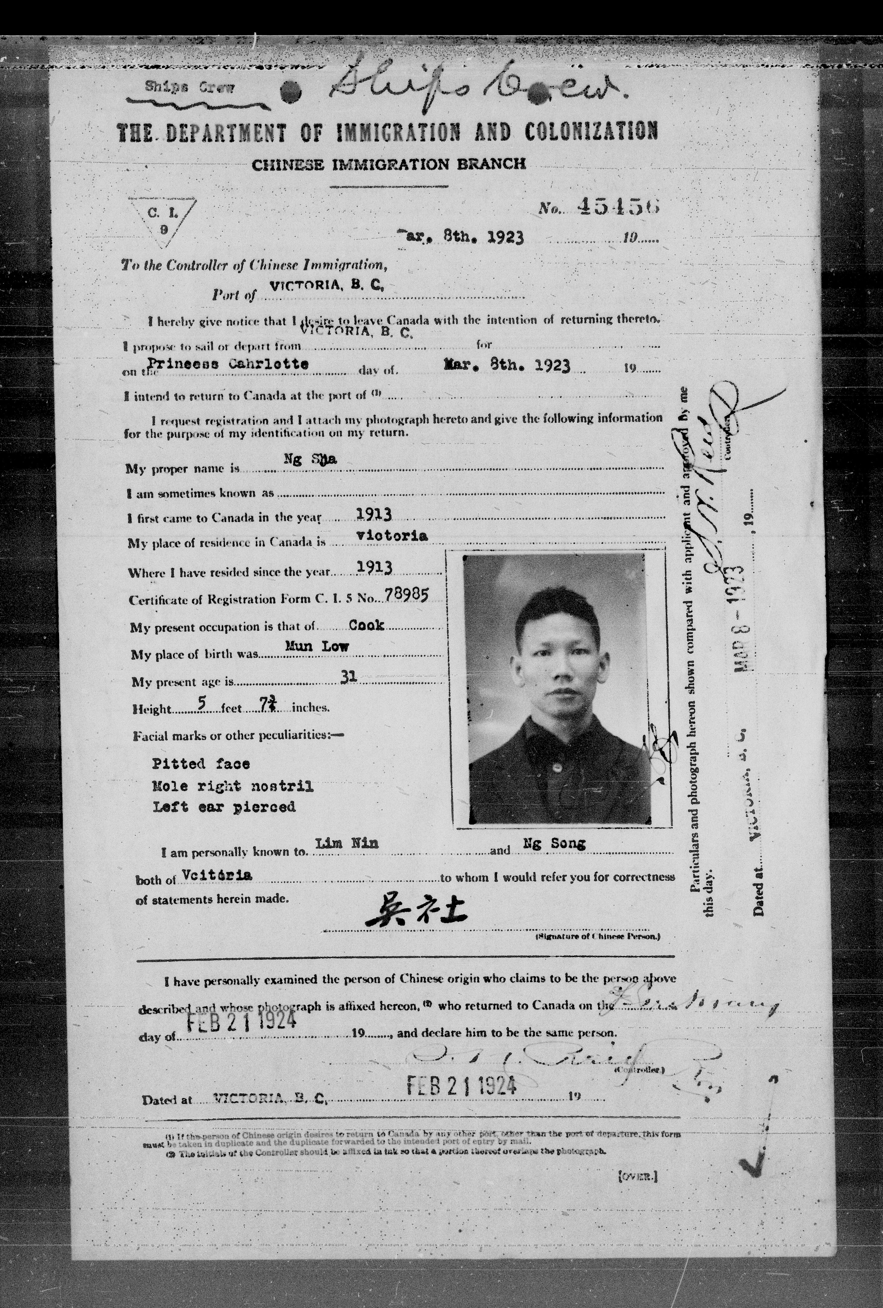 Chinese immigration records : C.I.9 certificates from Vancouver and Victoria