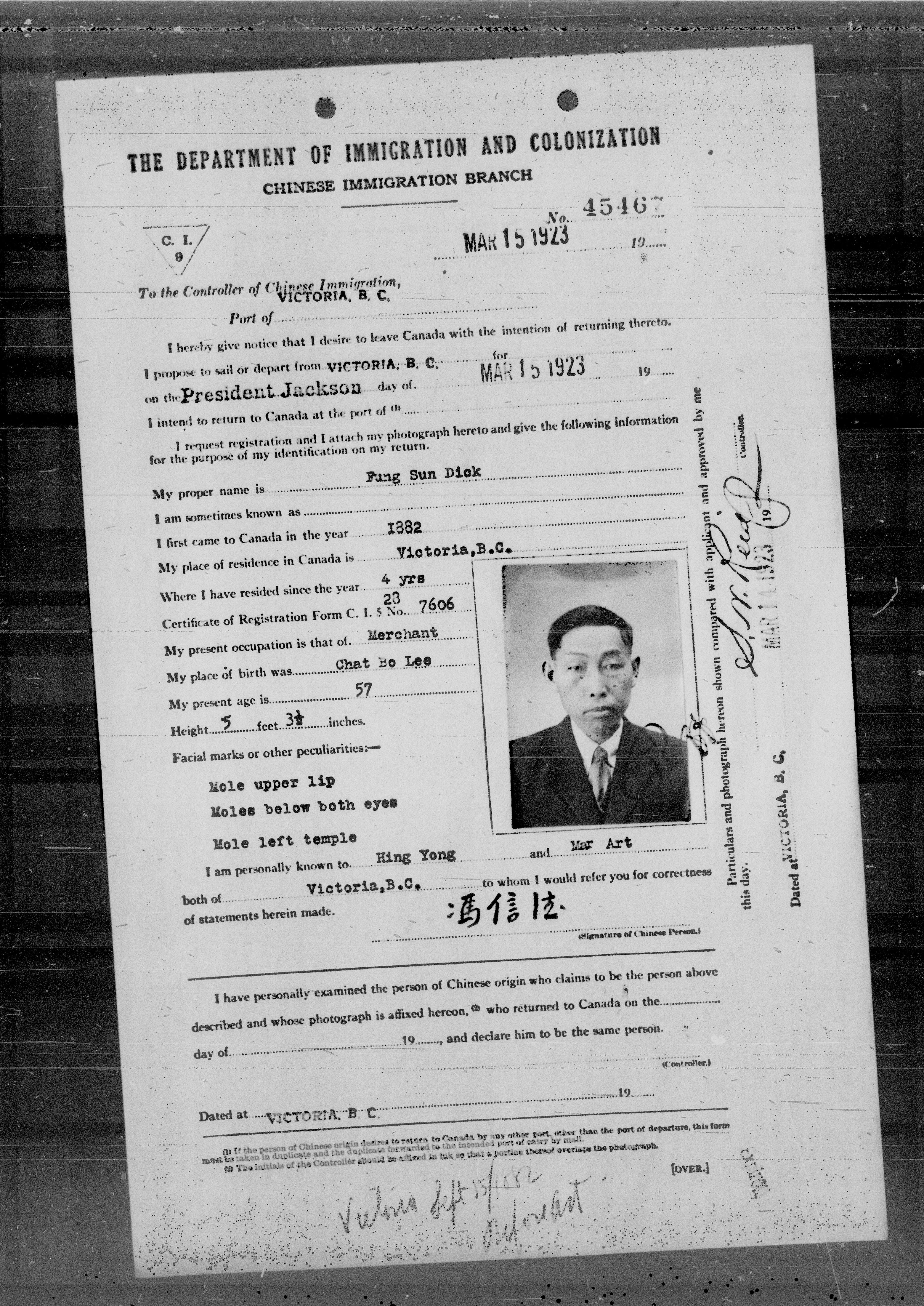 Chinese immigration records : C.I.9 certificates from Vancouver and Victoria