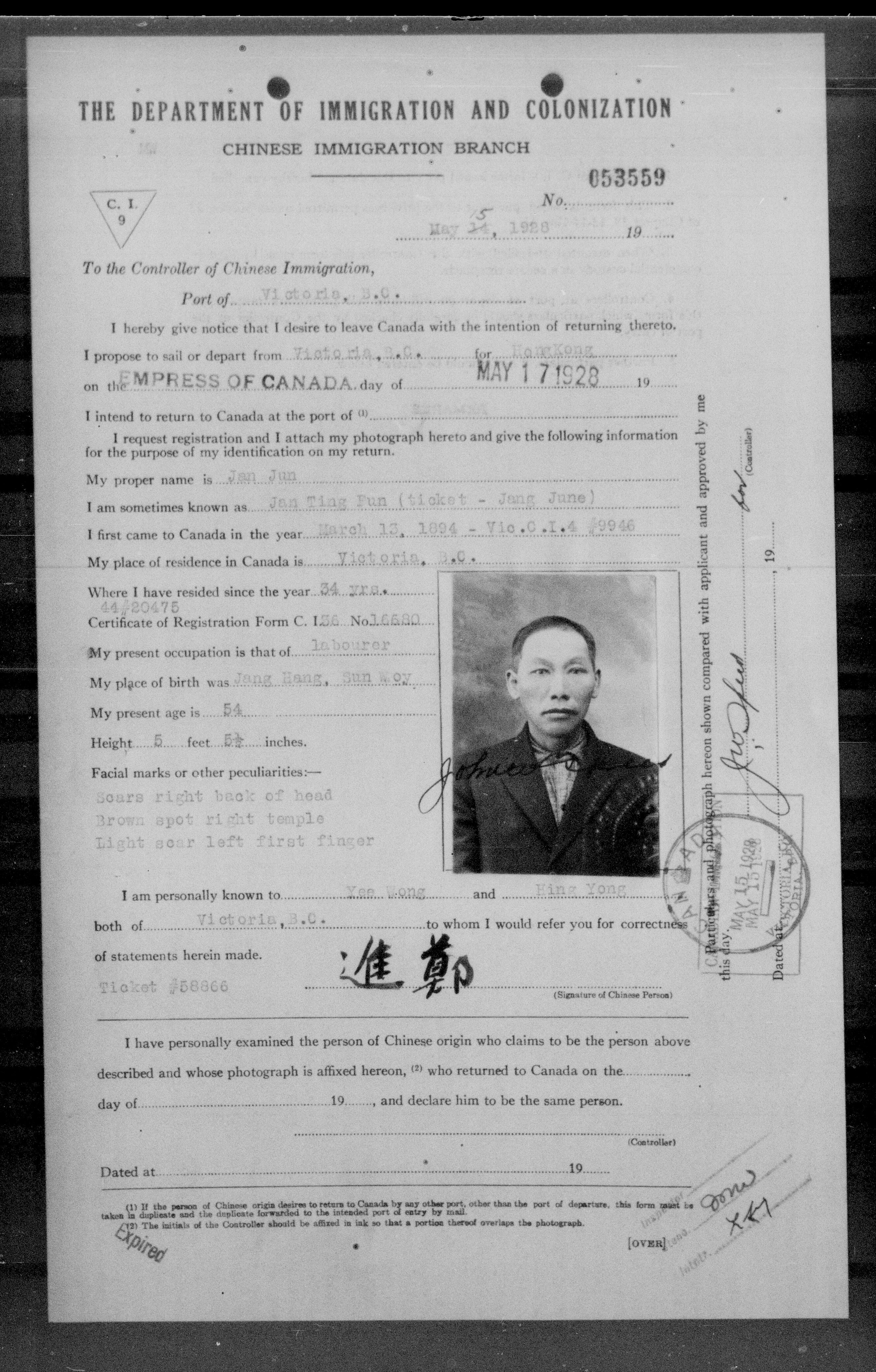 Chinese immigration records : C.I.9 certificates from Vancouver and Victoria