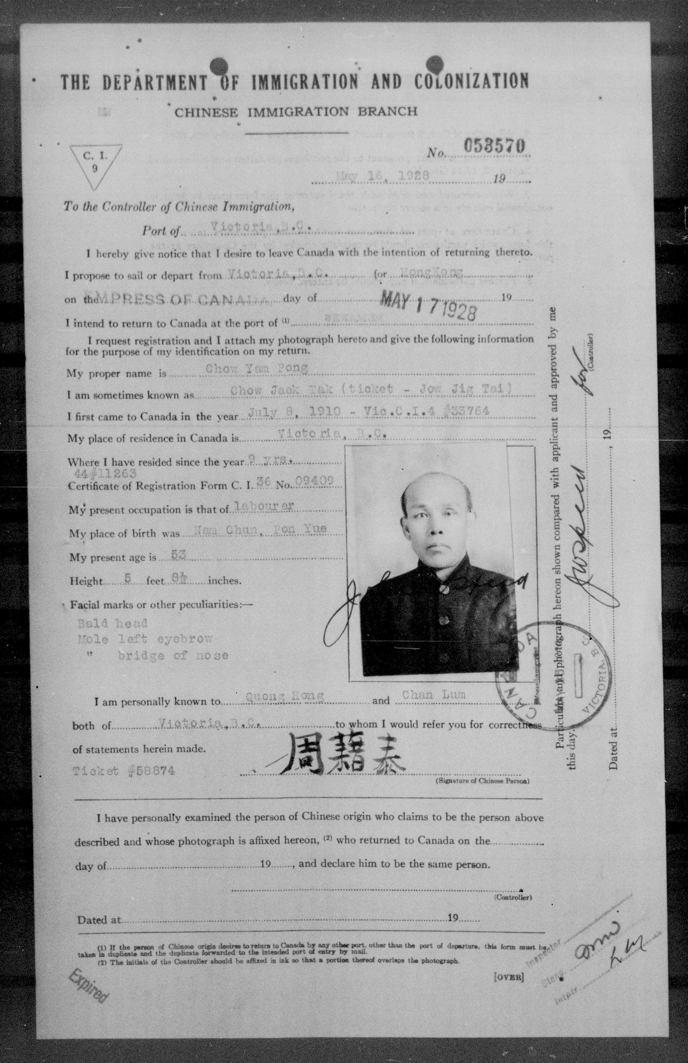 Chinese immigration records : C.I.9 certificates from Vancouver and Victoria