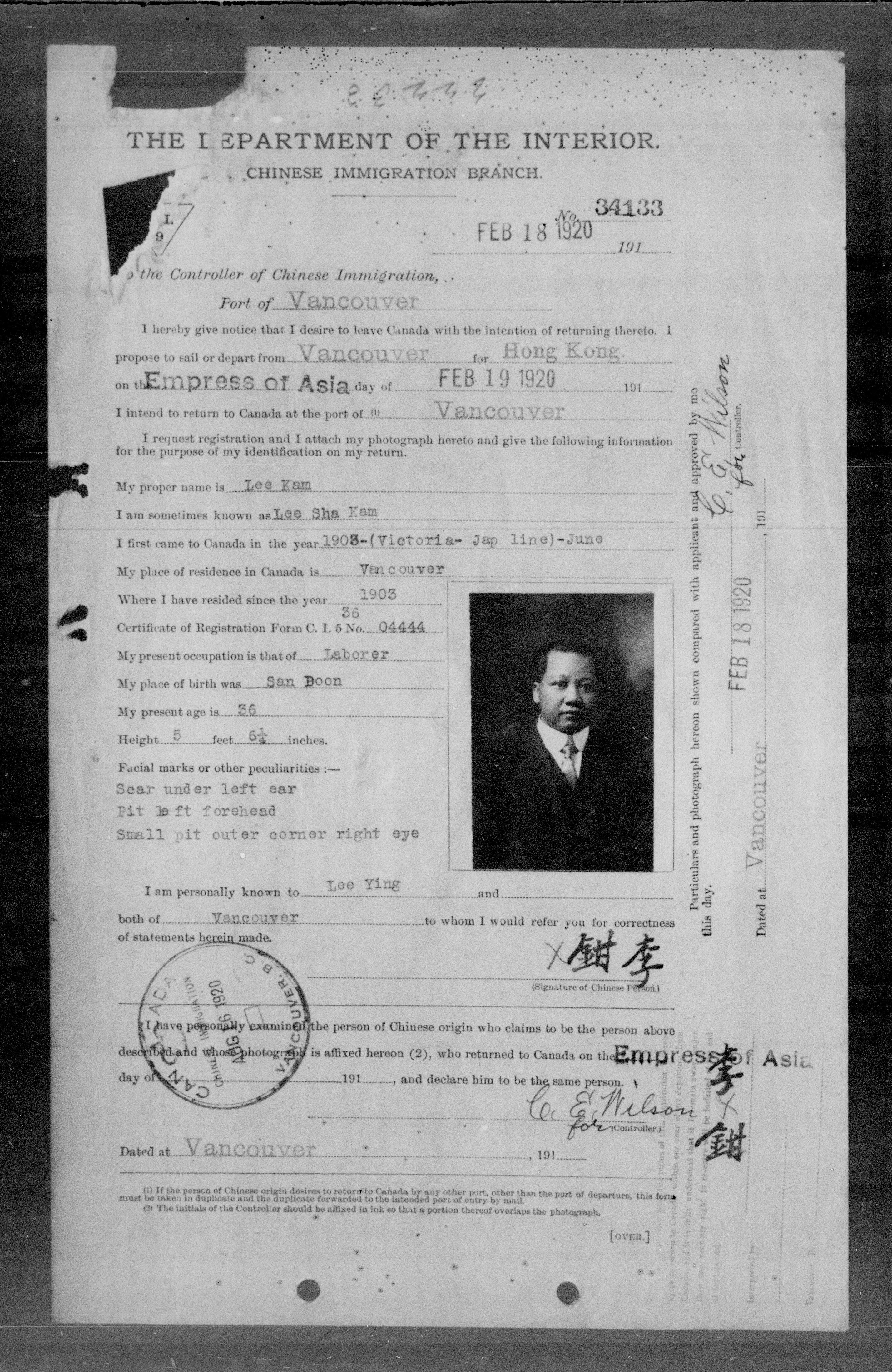 Chinese immigration records : C.I.9 certificates from Vancouver and Victoria