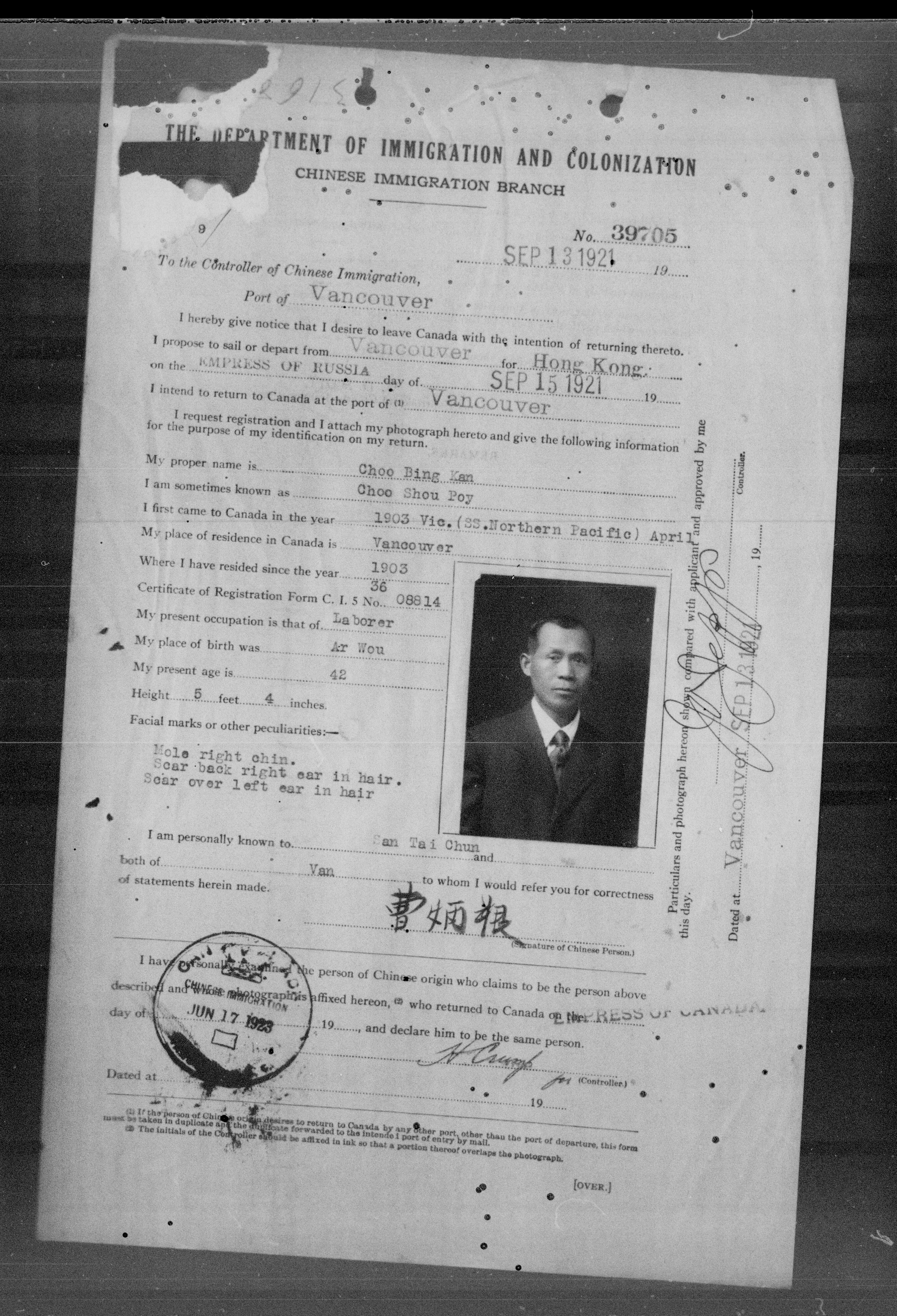 Chinese immigration records : C.I.9 certificates from Vancouver and Victoria