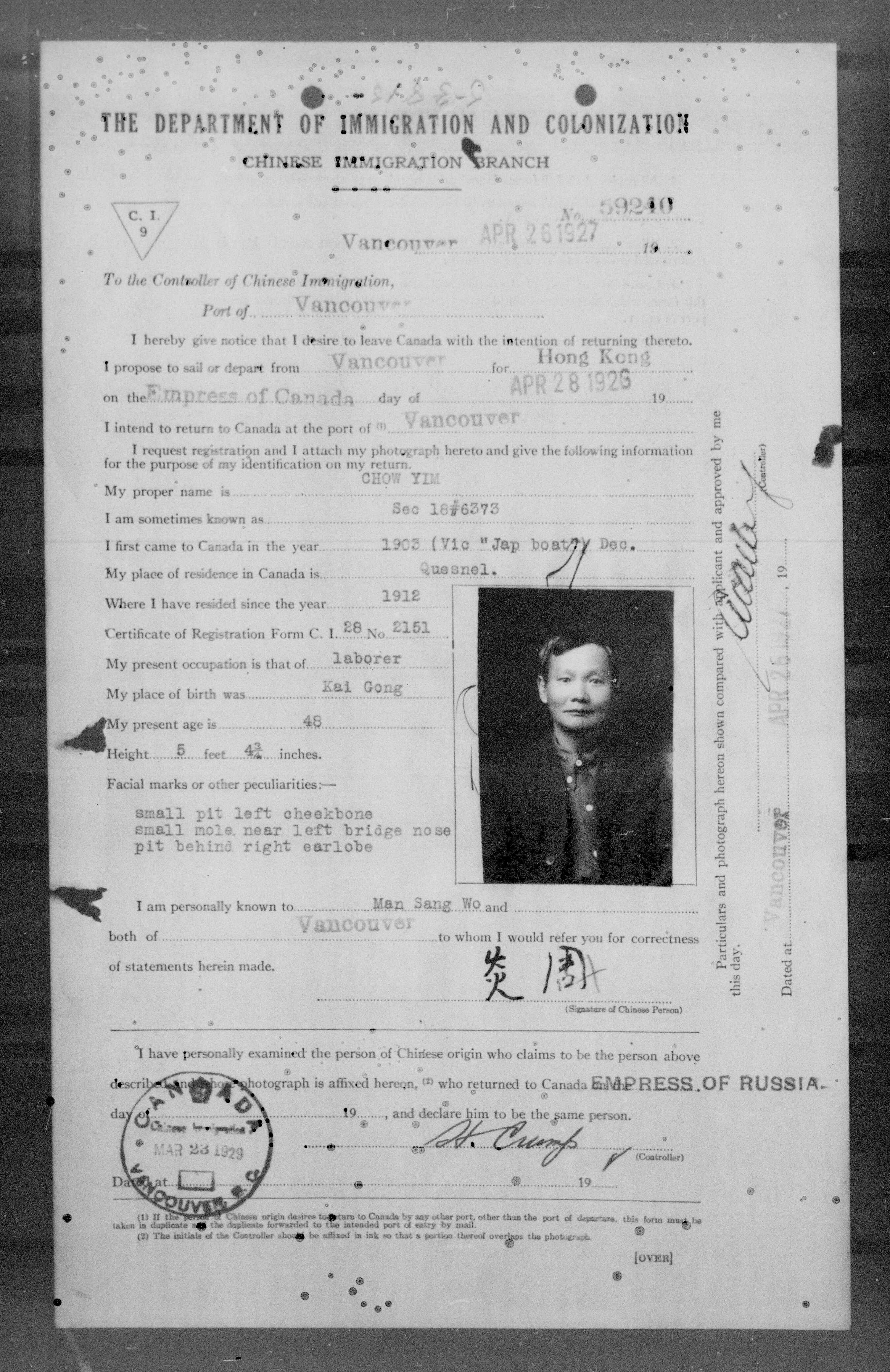 Chinese immigration records : C.I.9 certificates from Vancouver and Victoria