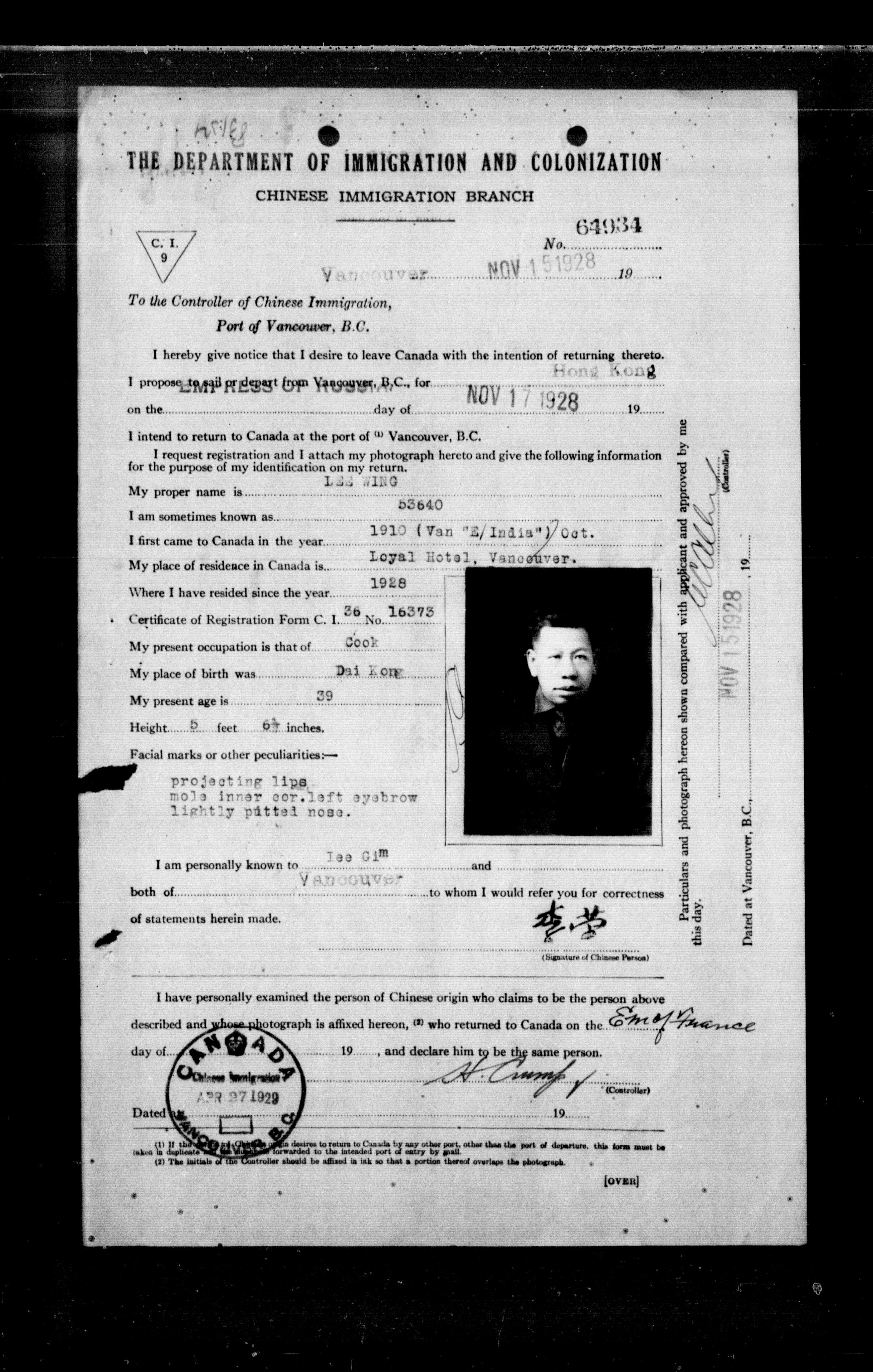 Chinese immigration records : C.I.9 certificates from Vancouver and Victoria
