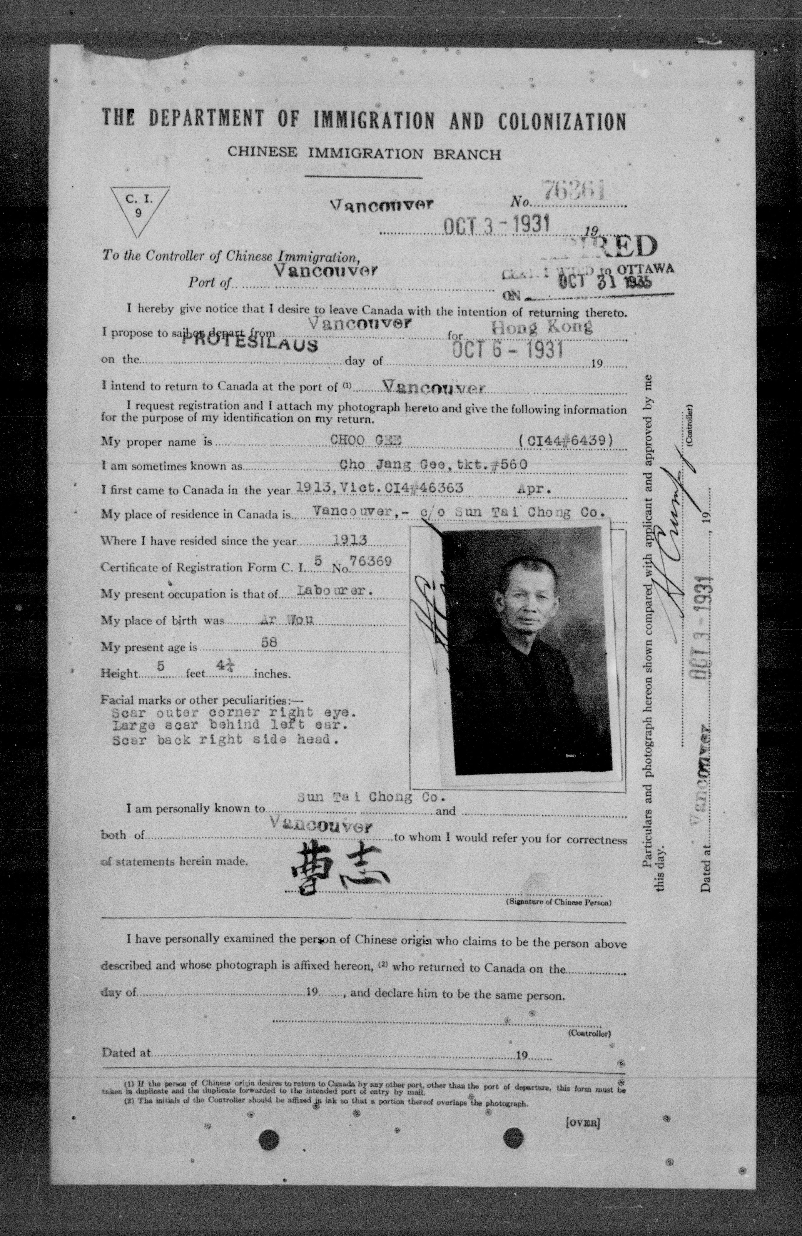 Chinese immigration records : C.I.9 certificates from Vancouver and Victoria