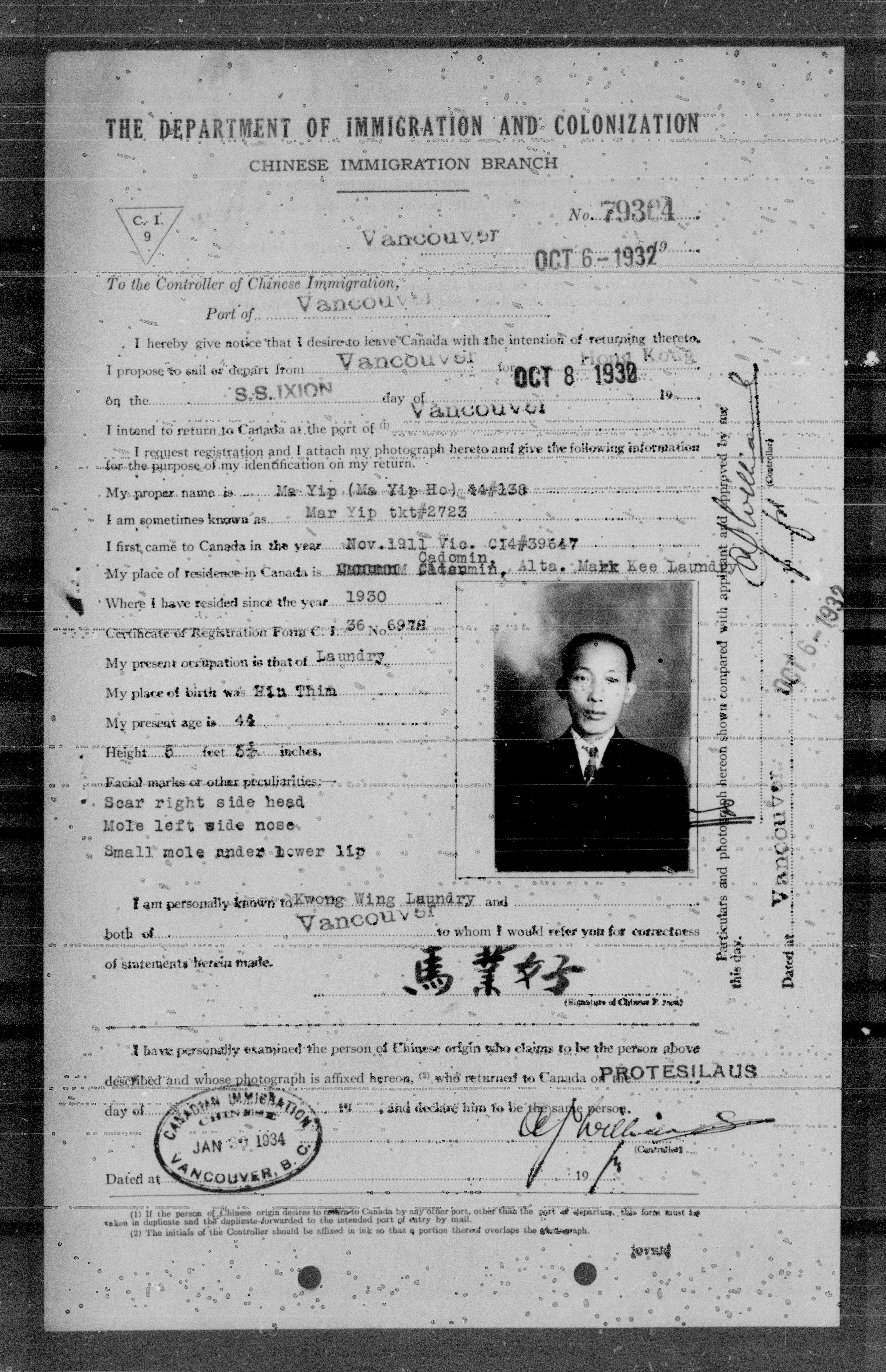Chinese immigration records : C.I.9 certificates from Vancouver and Victoria