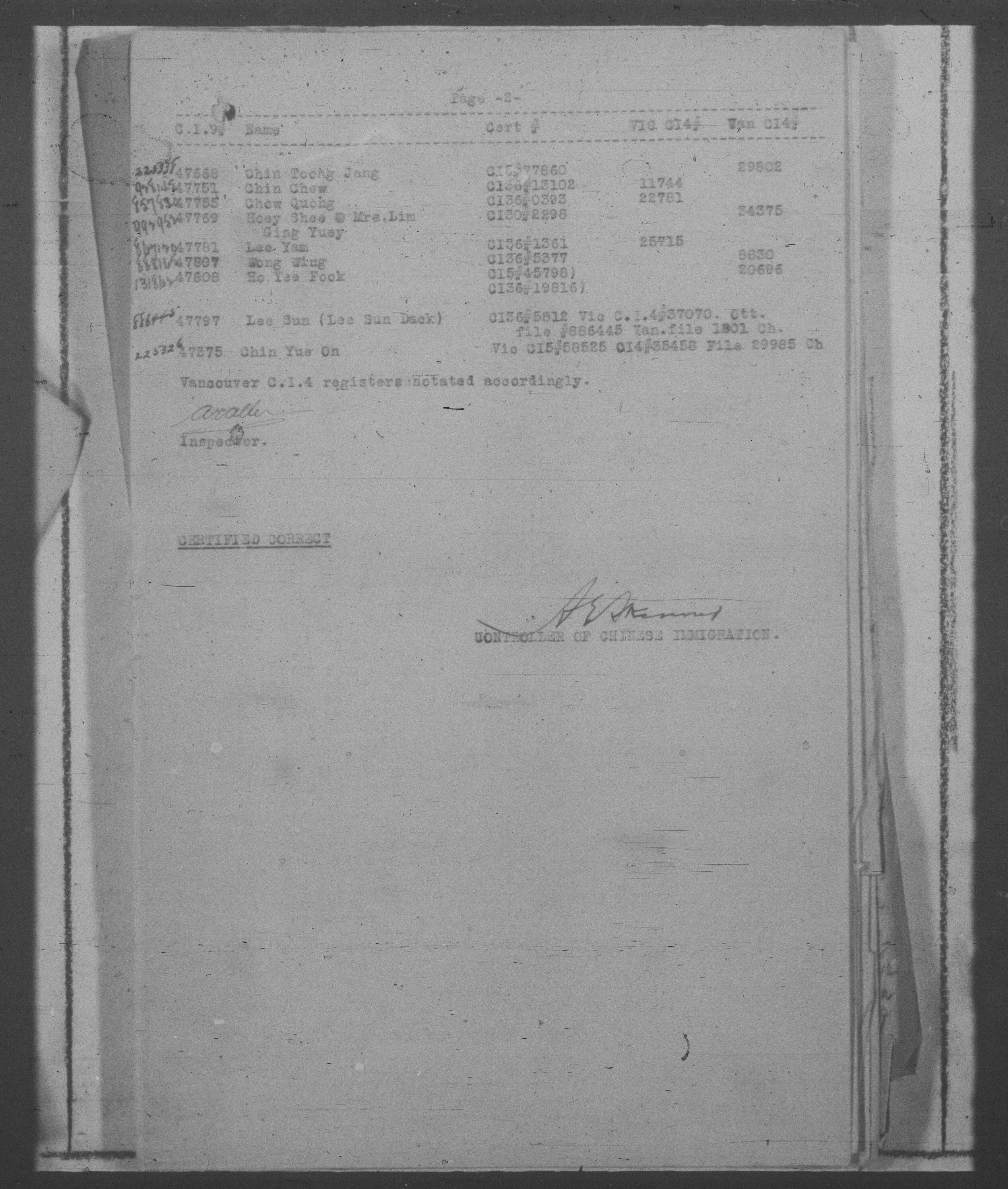 List of Chinese admitted at the Port of Vancouver under C.I. 9 certificates/records of returned C.I. 9