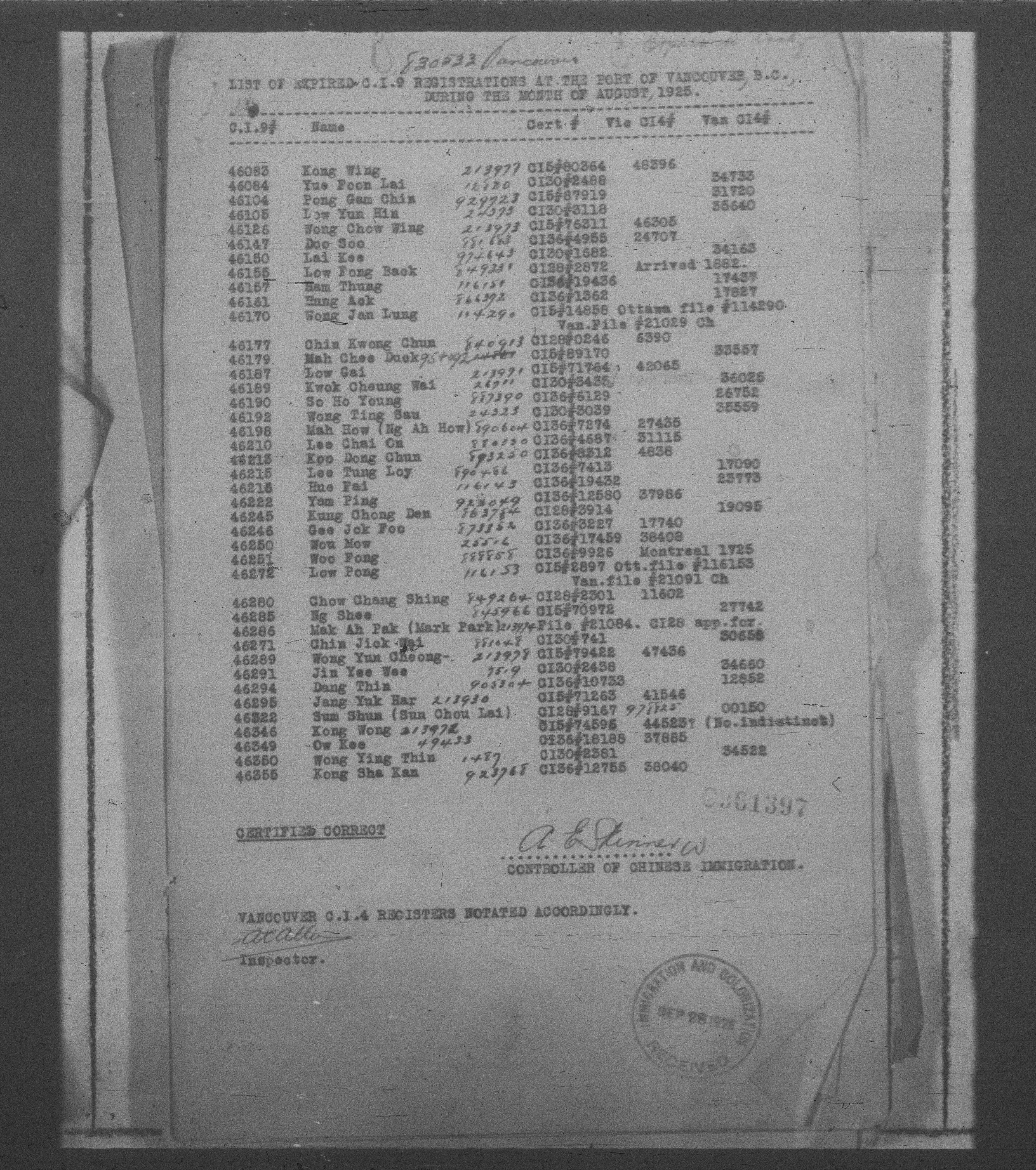 List of Chinese admitted at the Port of Vancouver under C.I. 9 certificates/records of returned C.I. 9