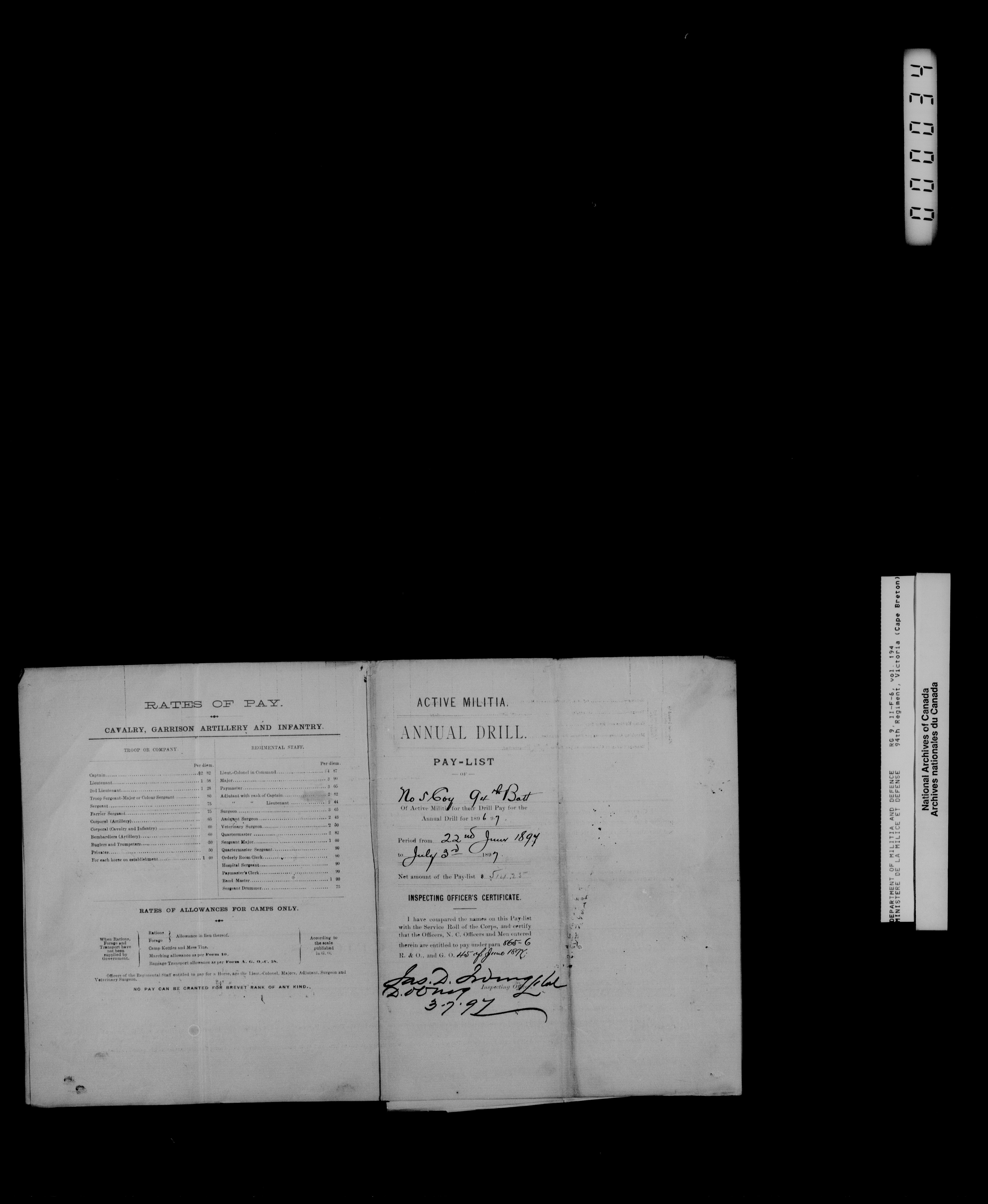 Nominal rolls and paylists for the Volunteer Militia (Vol. 194, 94th Regiment, Victoria (Cape Breton) to Vol. 196th, 97th Regiment, Algonquin Rifles) - 16789