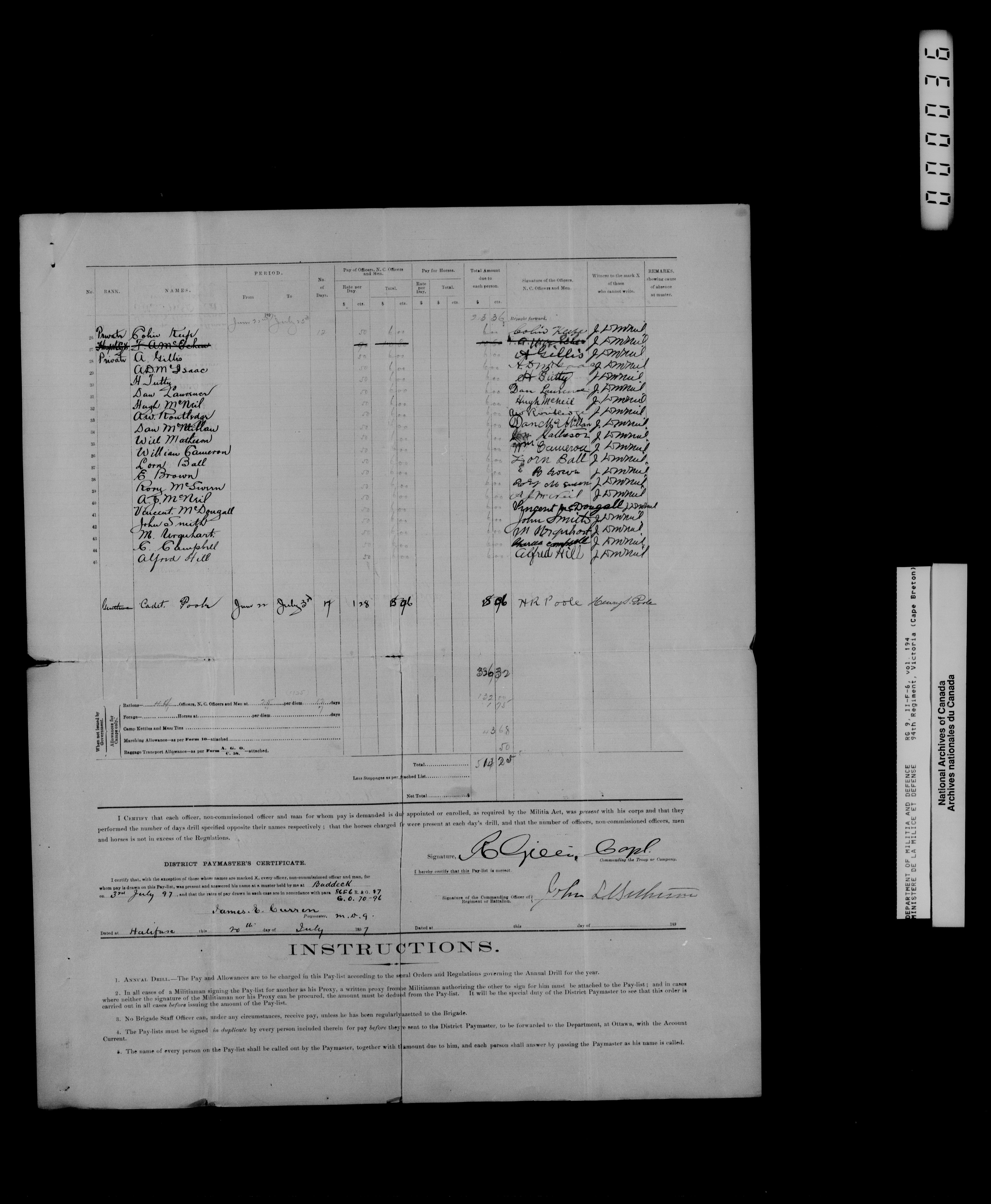 Nominal rolls and paylists for the Volunteer Militia (Vol. 194, 94th Regiment, Victoria (Cape Breton) to Vol. 196th, 97th Regiment, Algonquin Rifles) - 16789