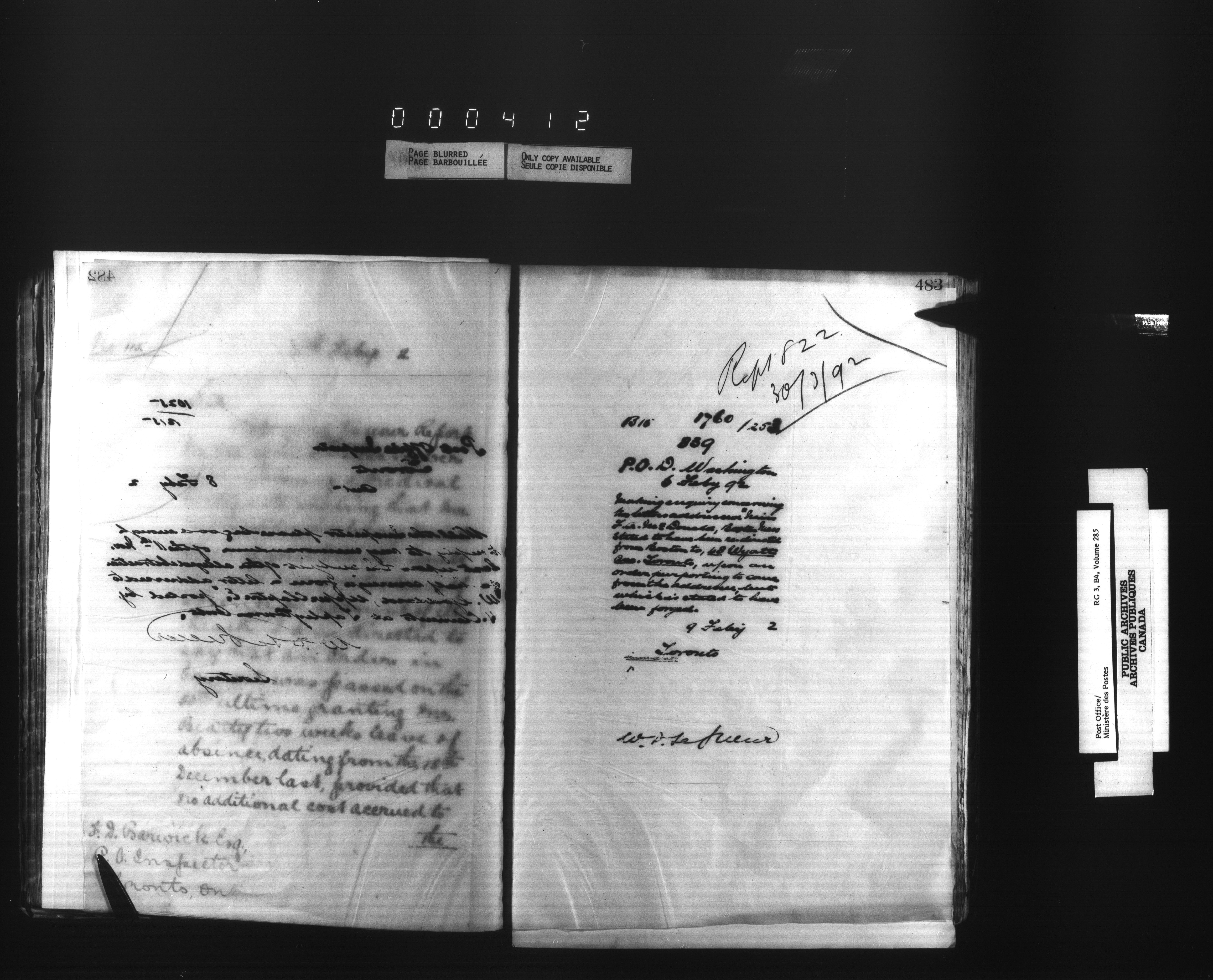 Correspondence from the Secretary to Post Office Inspectors : Letterbooks, Ontario- Toronto - 1700