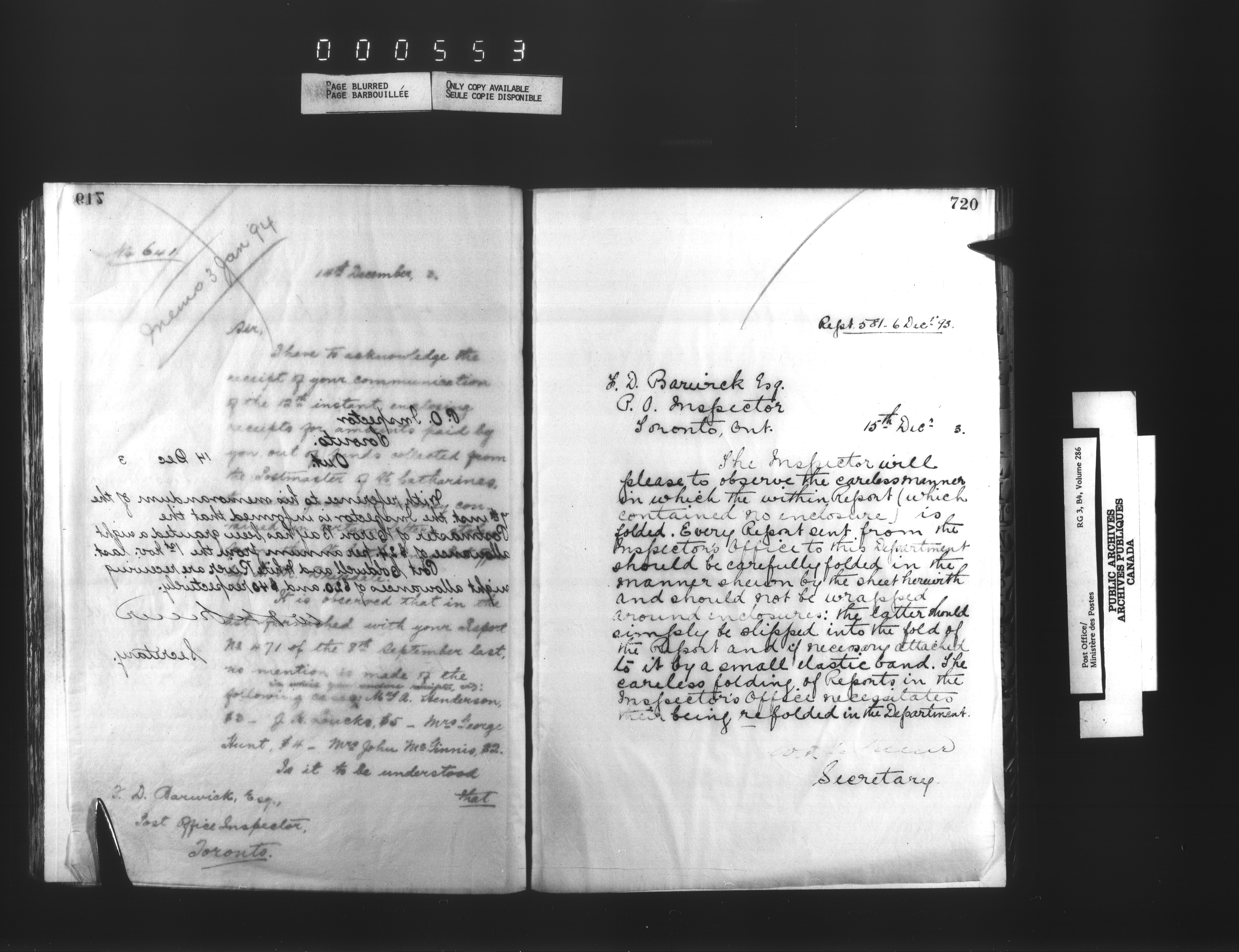 Correspondence from the Secretary to Post Office Inspectors : Letterbooks, Ontario- Toronto - 1702