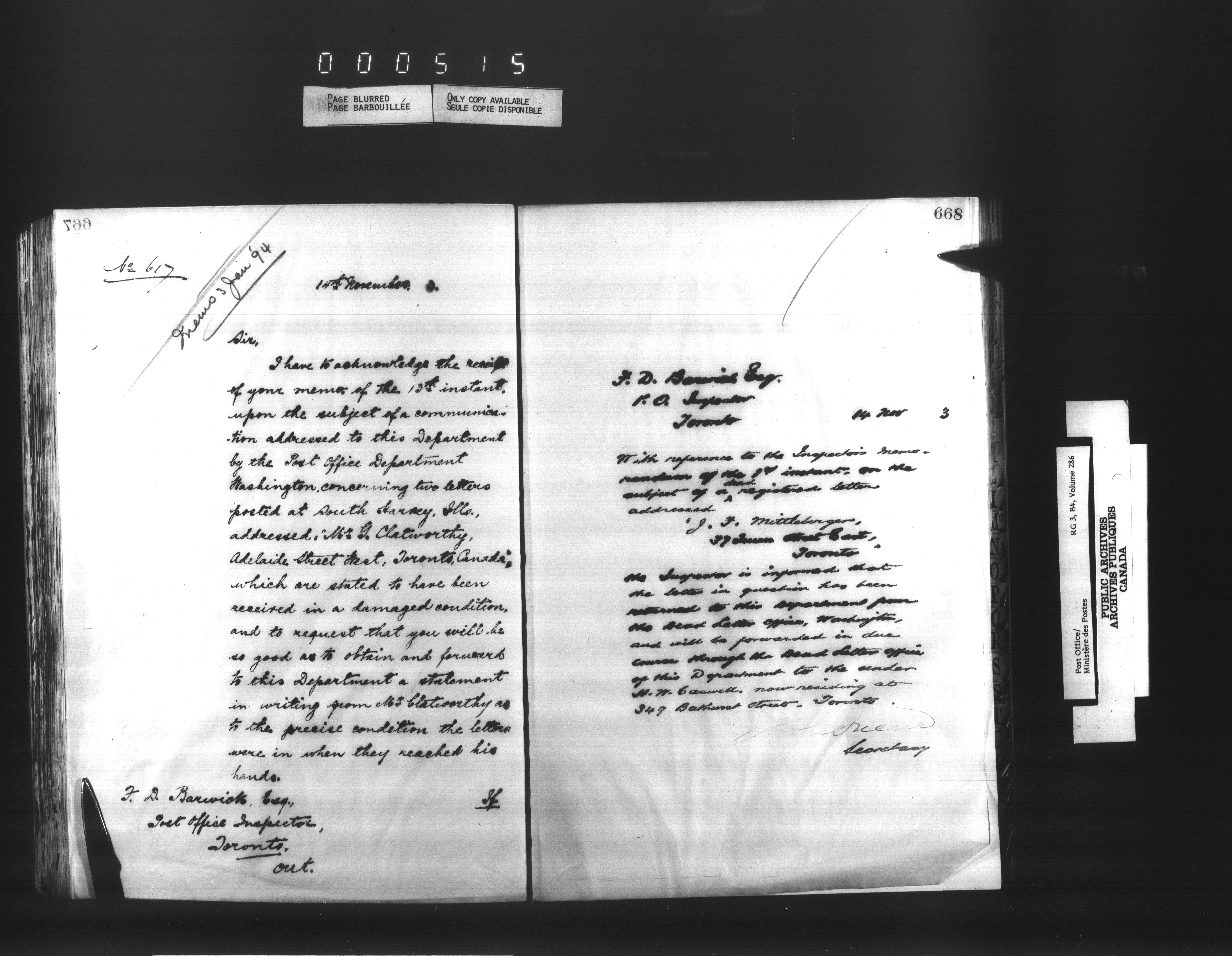 Correspondence from the Secretary to Post Office Inspectors : Letterbooks, Ontario- Toronto - 1702