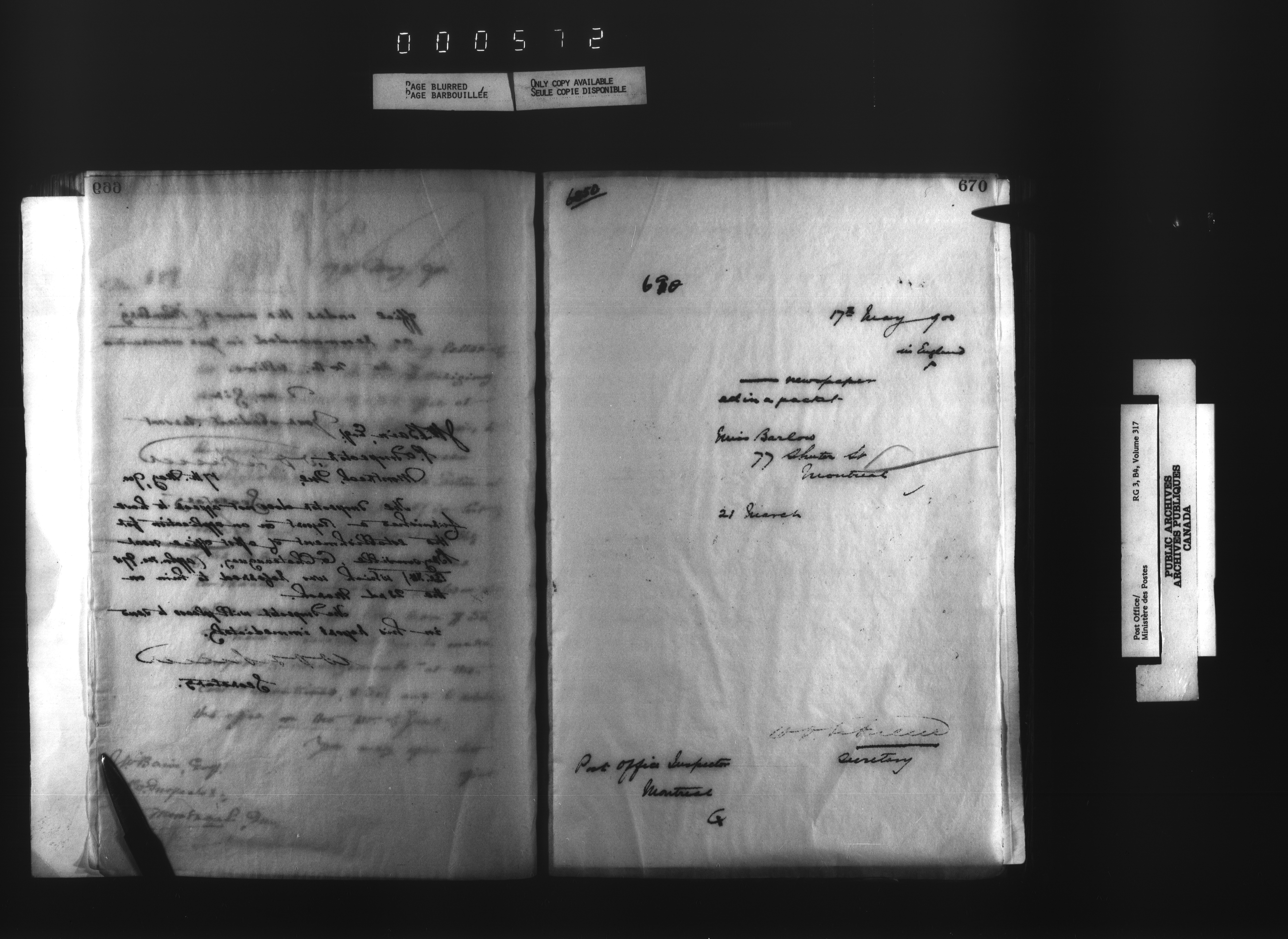 Correspondence from the Secretary to Post Office Inspectors : Letterbooks, Quebec- Montreal - 1725