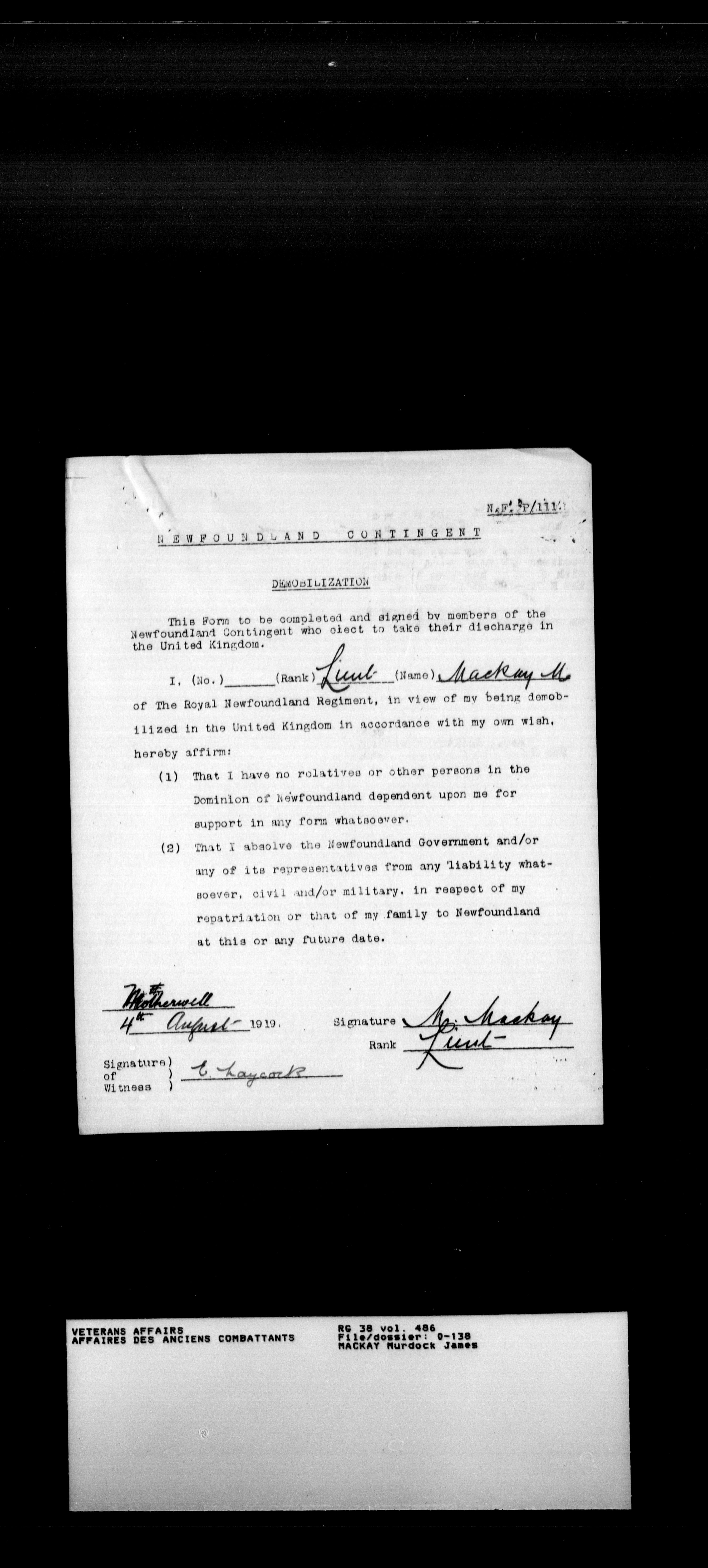 Military service files for members of the Royal Newfoundland Regiment and bandsmen and the Newfoundland Forestry Corps (1914-1919) - 18013