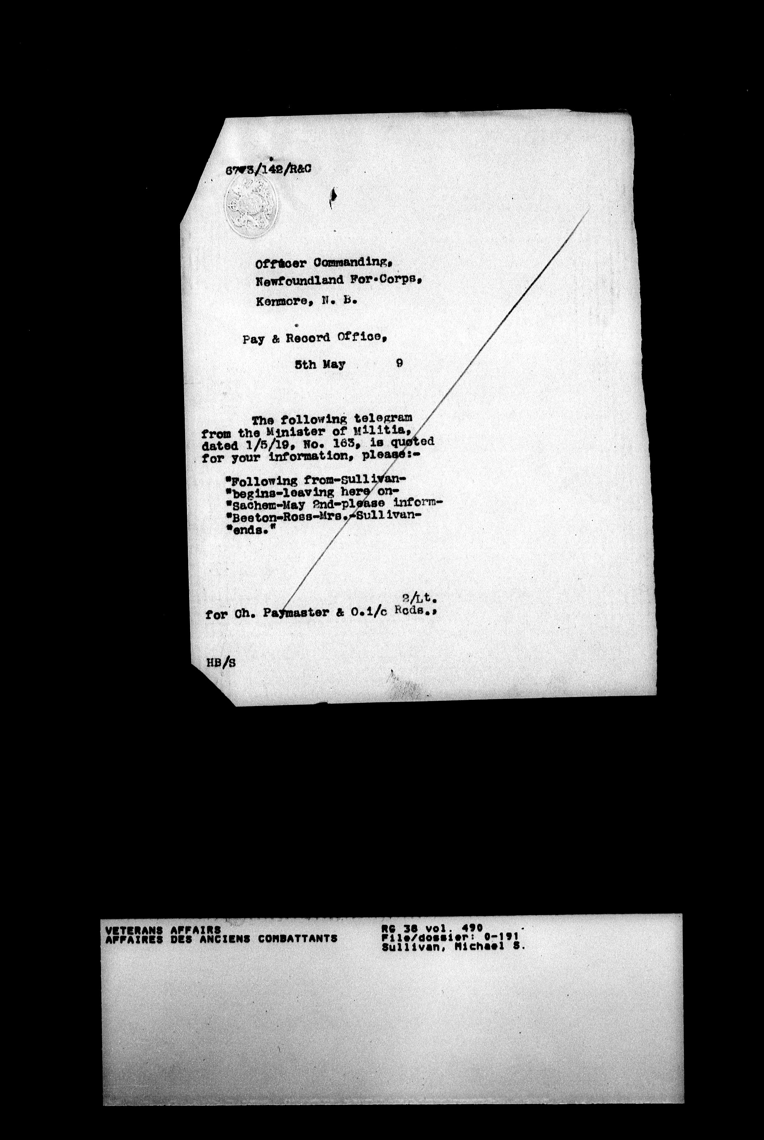 Military service files for members of the Royal Newfoundland Regiment and bandsmen and the Newfoundland Forestry Corps (1914-1919) - 18017