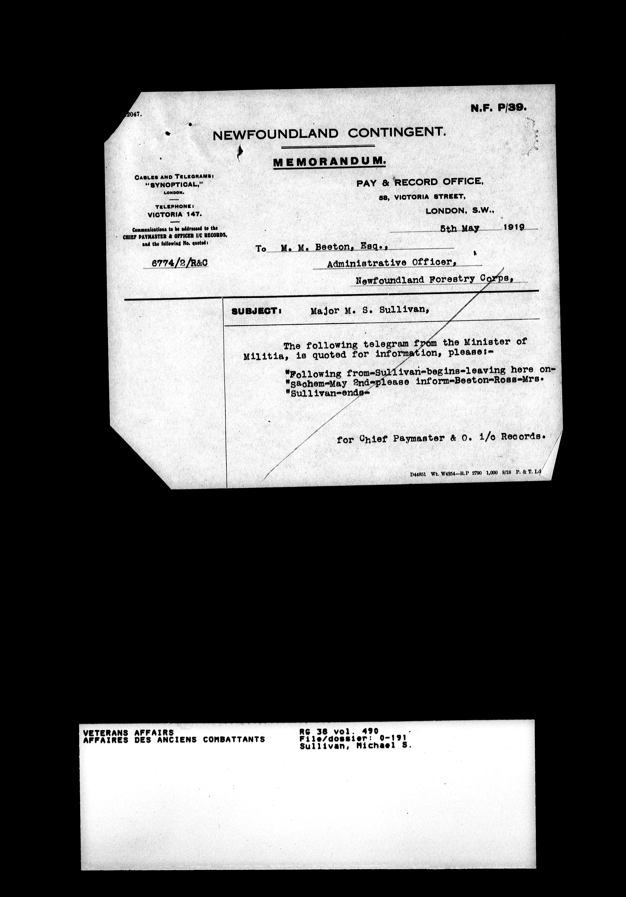 Military service files for members of the Royal Newfoundland Regiment and bandsmen and the Newfoundland Forestry Corps (1914-1919) - 18017