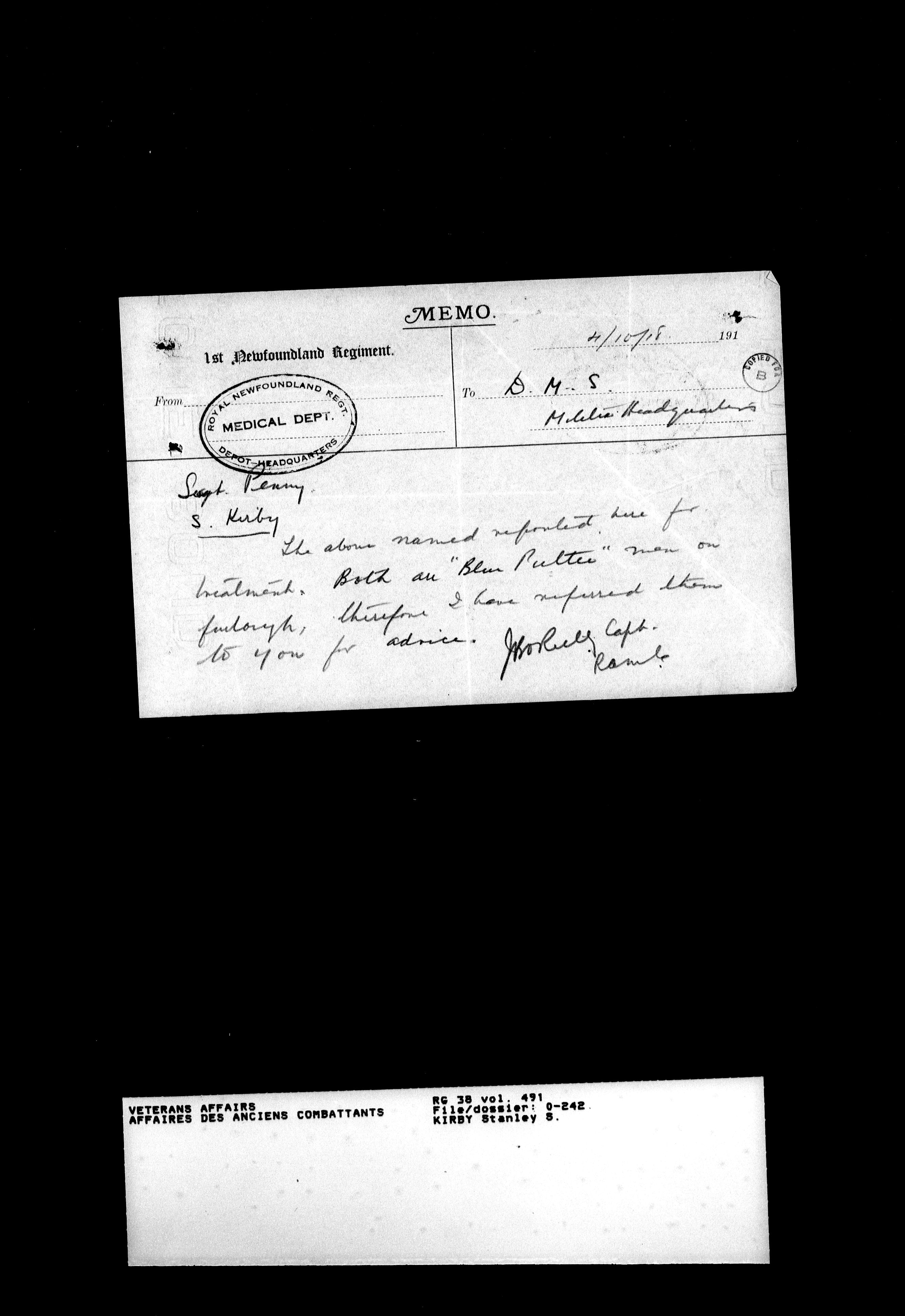 Military service files for members of the Royal Newfoundland Regiment and bandsmen and the Newfoundland Forestry Corps (1914-1919) - 18019