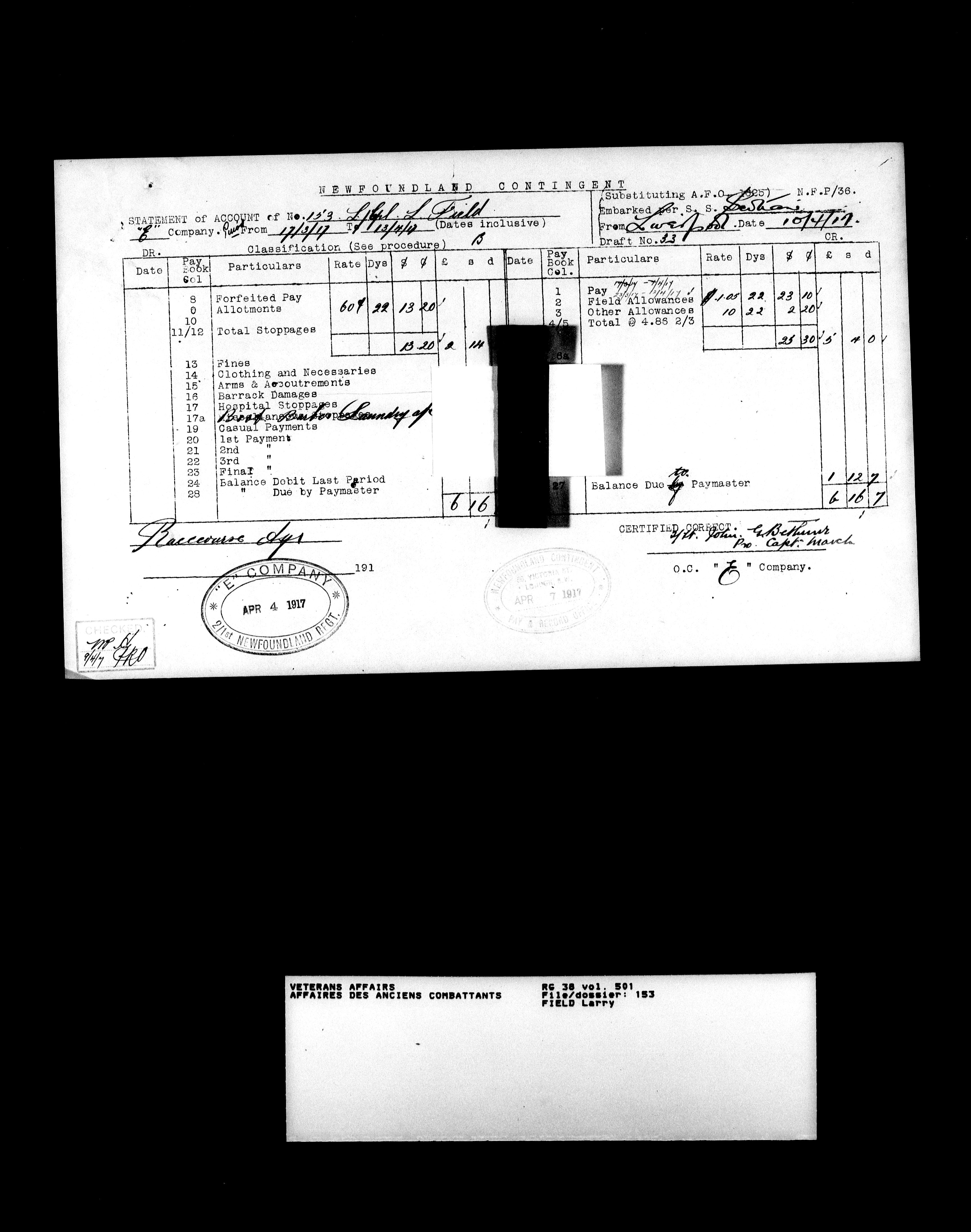 Military service files for members of the Royal Newfoundland Regiment and bandsmen and the Newfoundland Forestry Corps (1914-1919) - 18031
