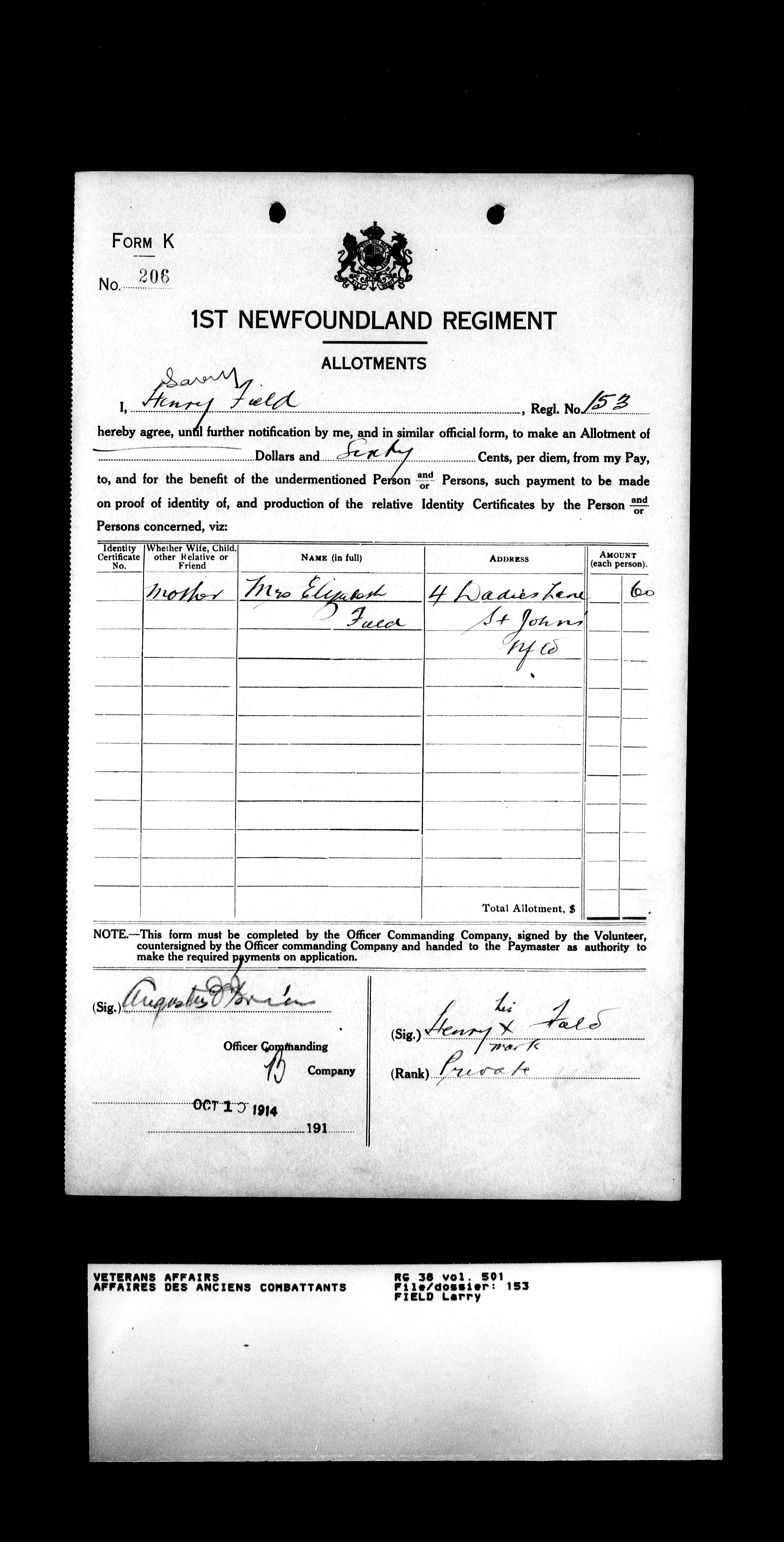 Military service files for members of the Royal Newfoundland Regiment and bandsmen and the Newfoundland Forestry Corps (1914-1919) - 18031