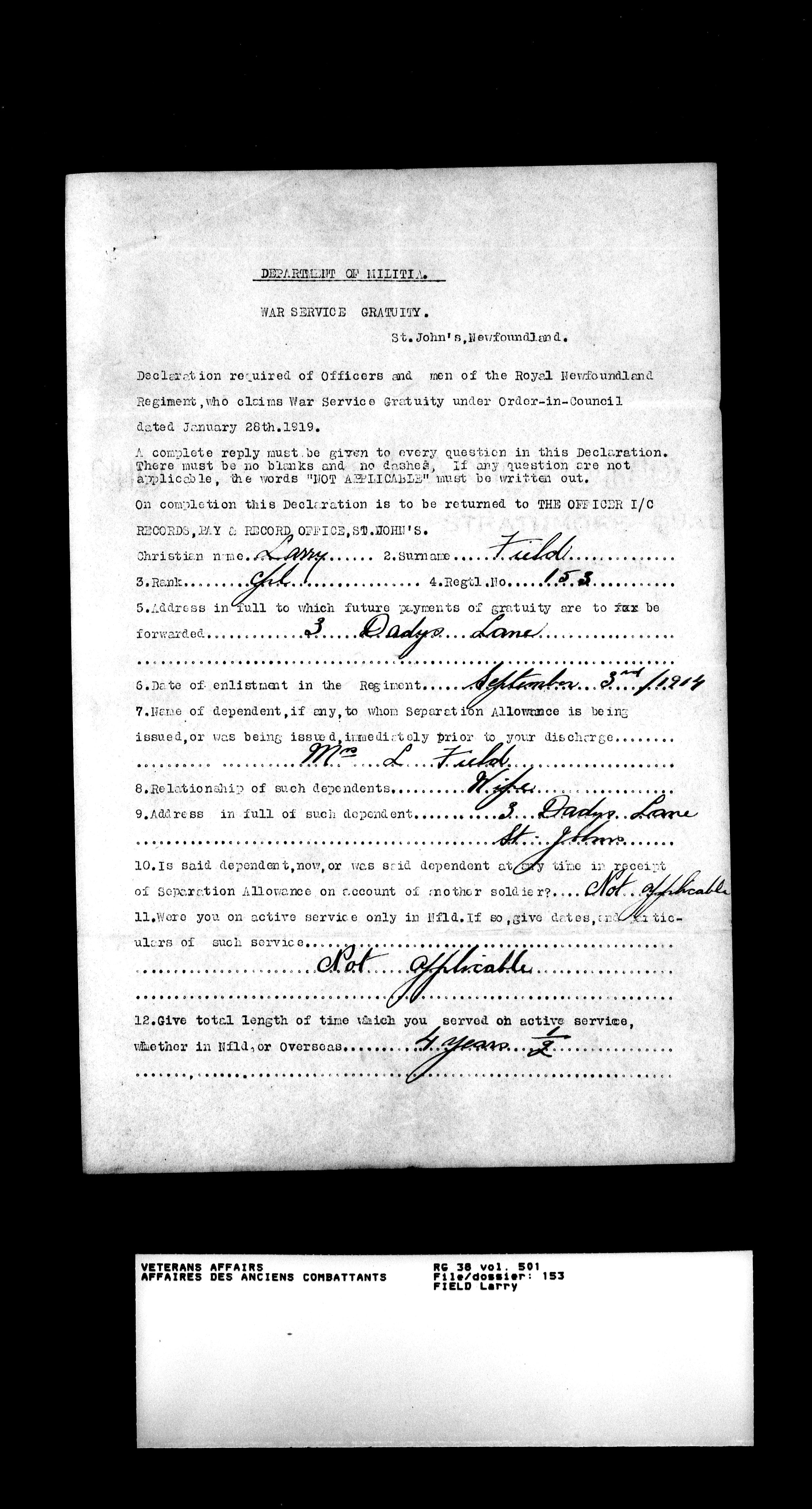 Military service files for members of the Royal Newfoundland Regiment and bandsmen and the Newfoundland Forestry Corps (1914-1919) - 18031