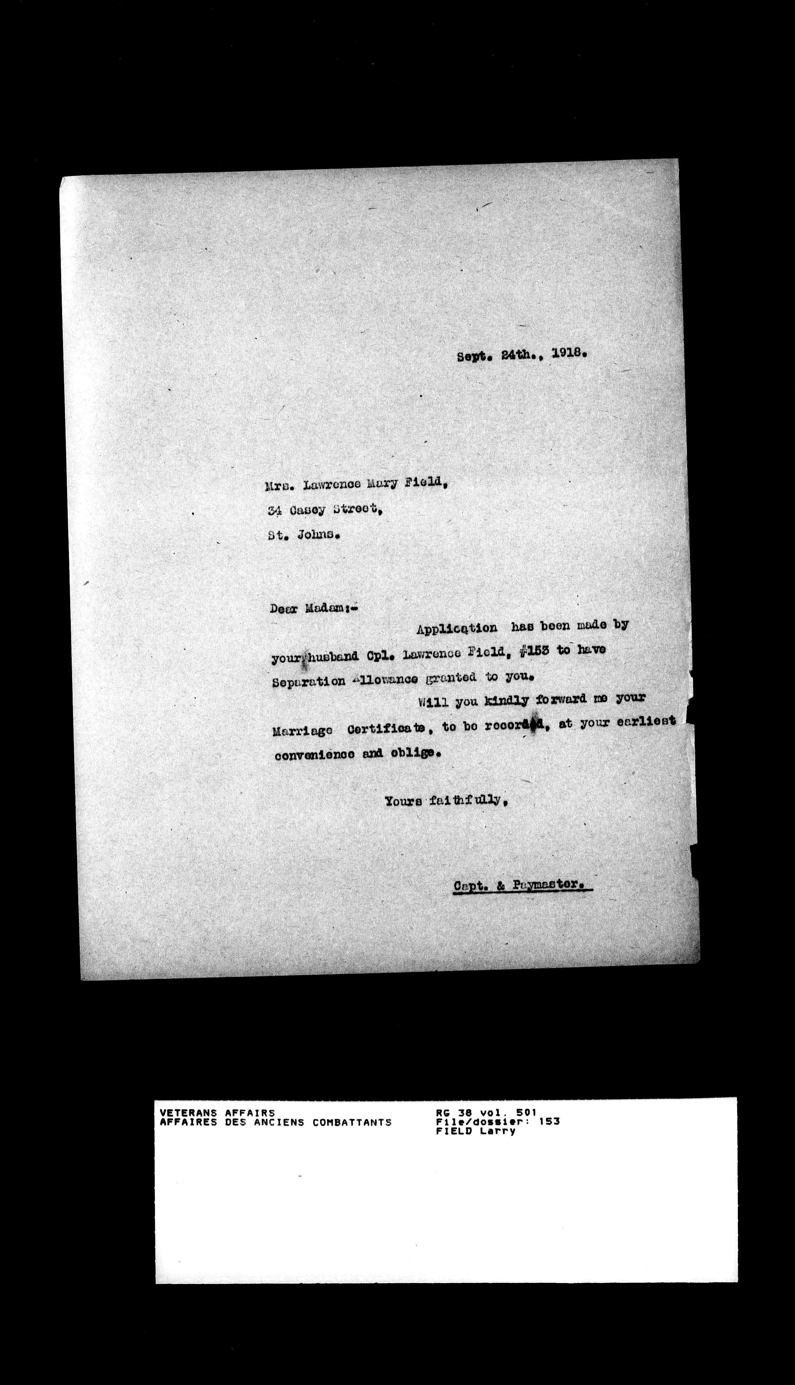 Military service files for members of the Royal Newfoundland Regiment and bandsmen and the Newfoundland Forestry Corps (1914-1919) - 18031
