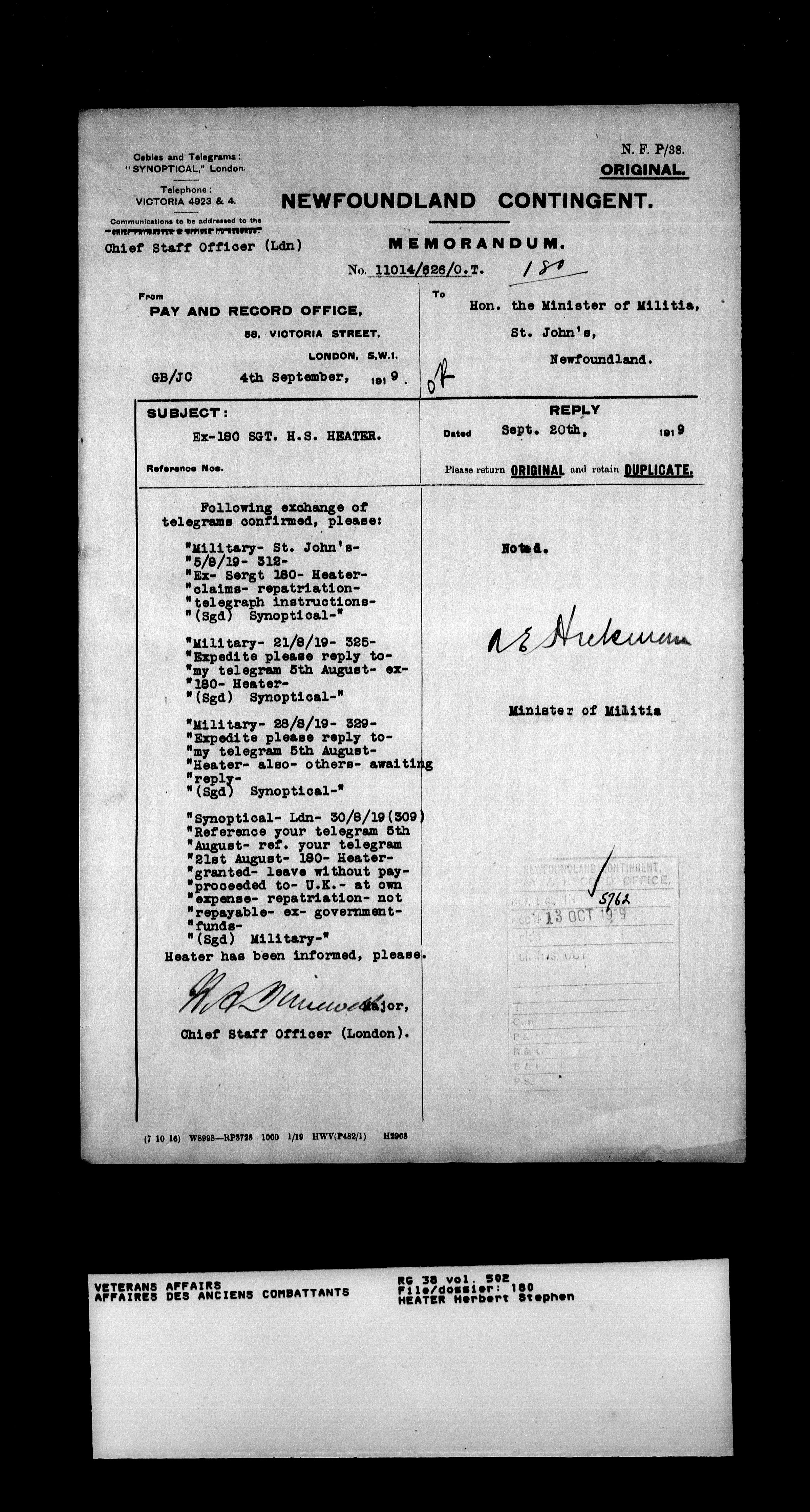 Military service files for members of the Royal Newfoundland Regiment and bandsmen and the Newfoundland Forestry Corps (1914-1919) - 18033