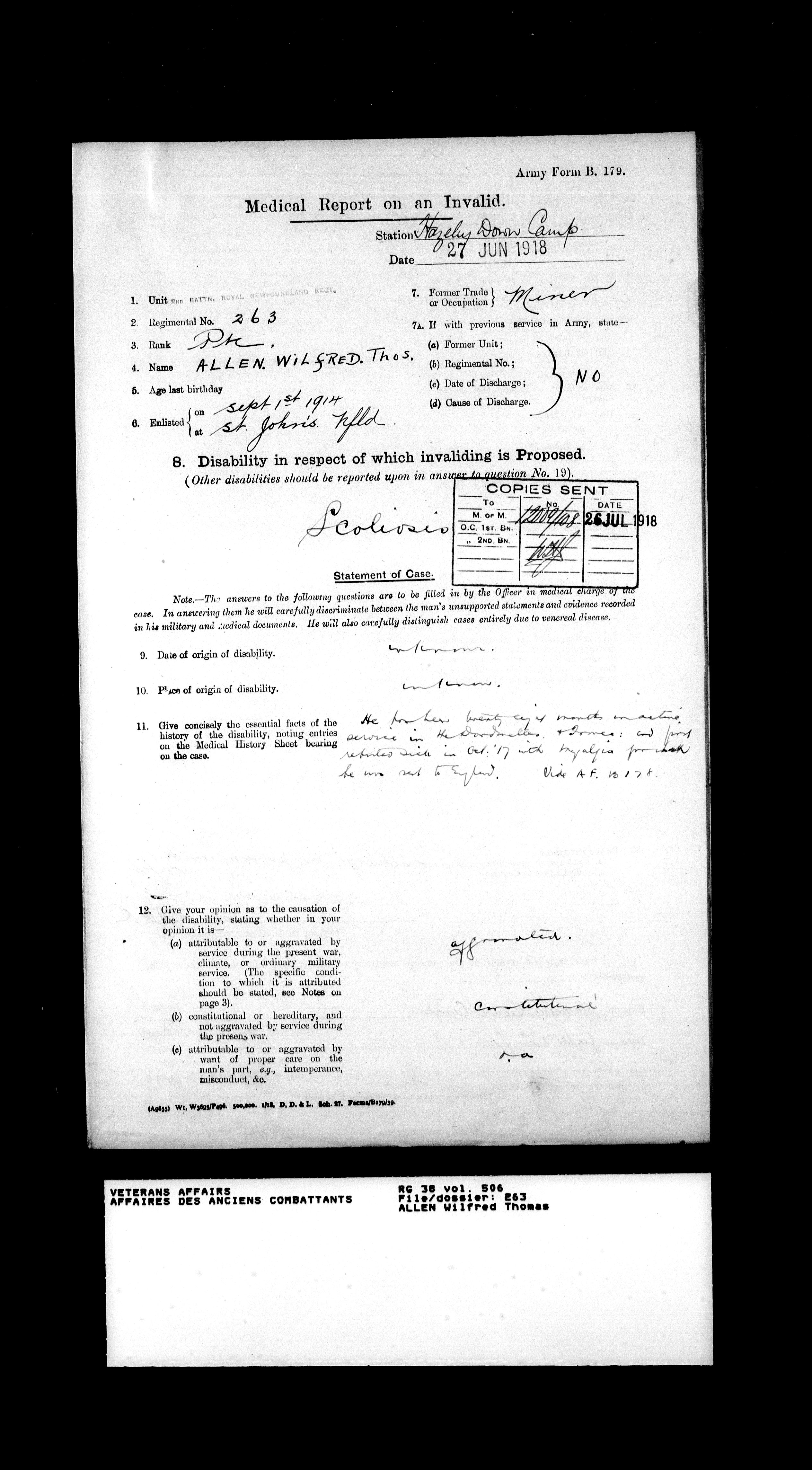 Military service files for members of the Royal Newfoundland Regiment and bandsmen and the Newfoundland Forestry Corps (1914-1919) - 18037