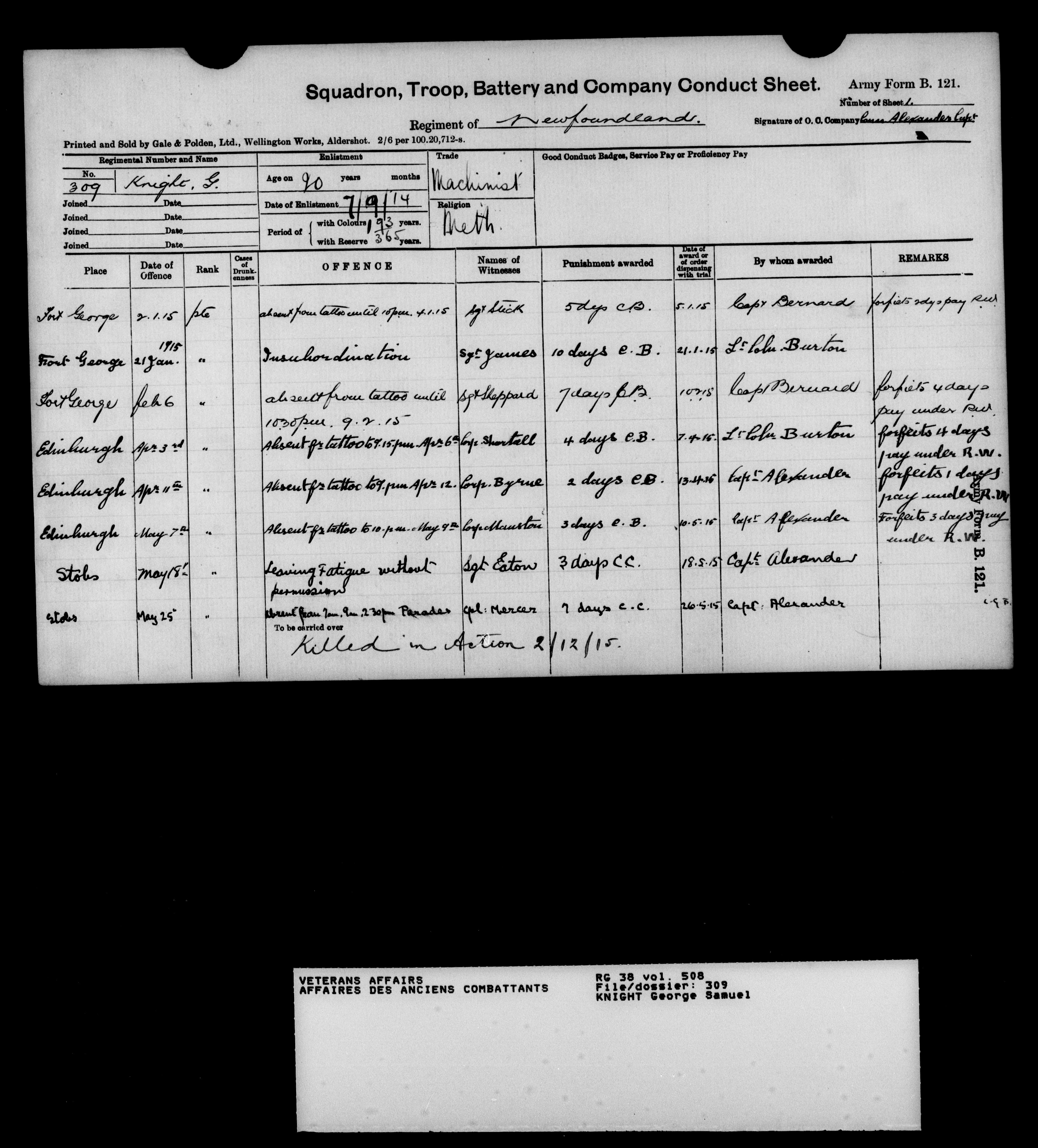 Military service files for members of the Royal Newfoundland Regiment and bandsmen and the Newfoundland Forestry Corps (1914-1919) - 18040