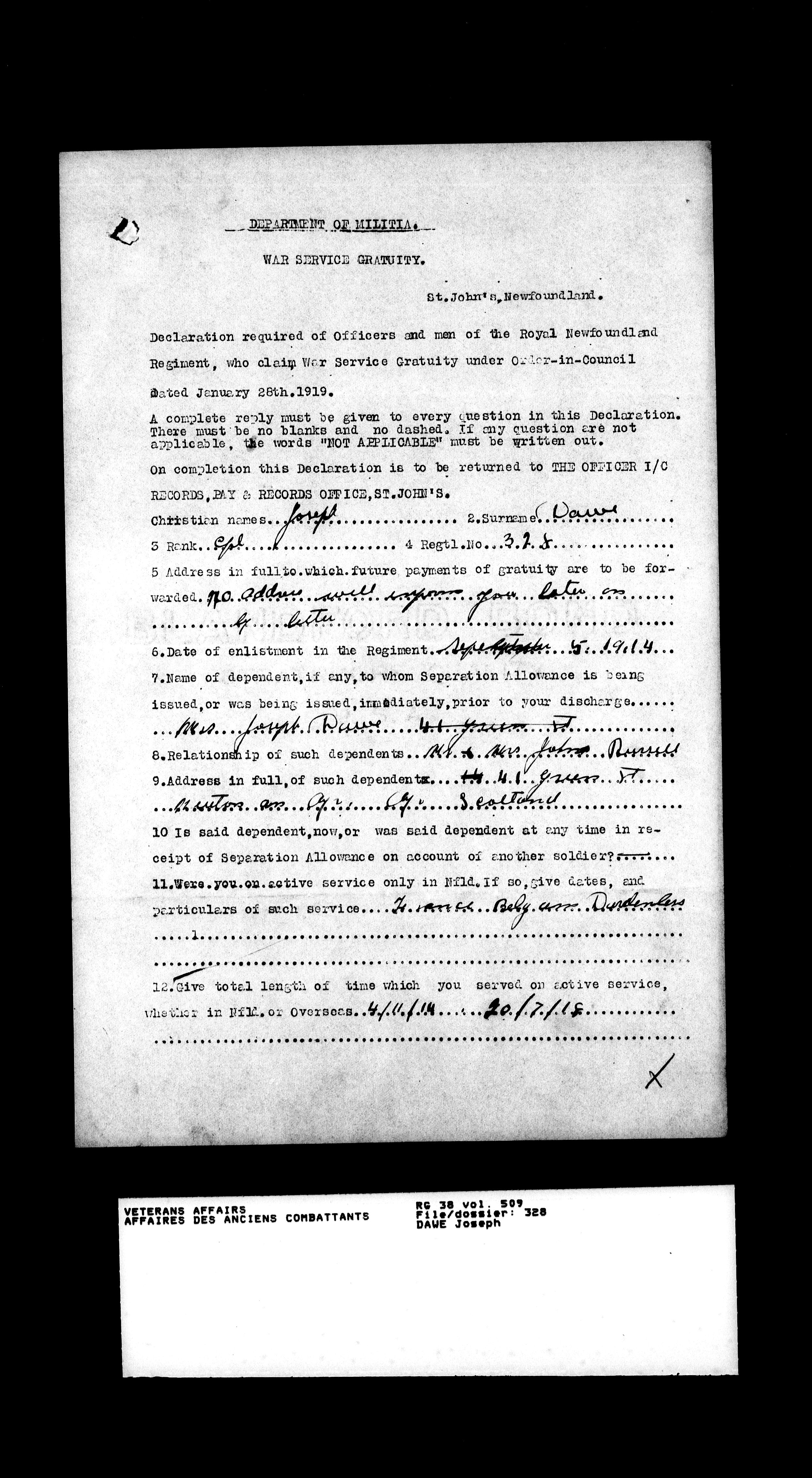 Military service files for members of the Royal Newfoundland Regiment and bandsmen and the Newfoundland Forestry Corps (1914-1919) - 18041