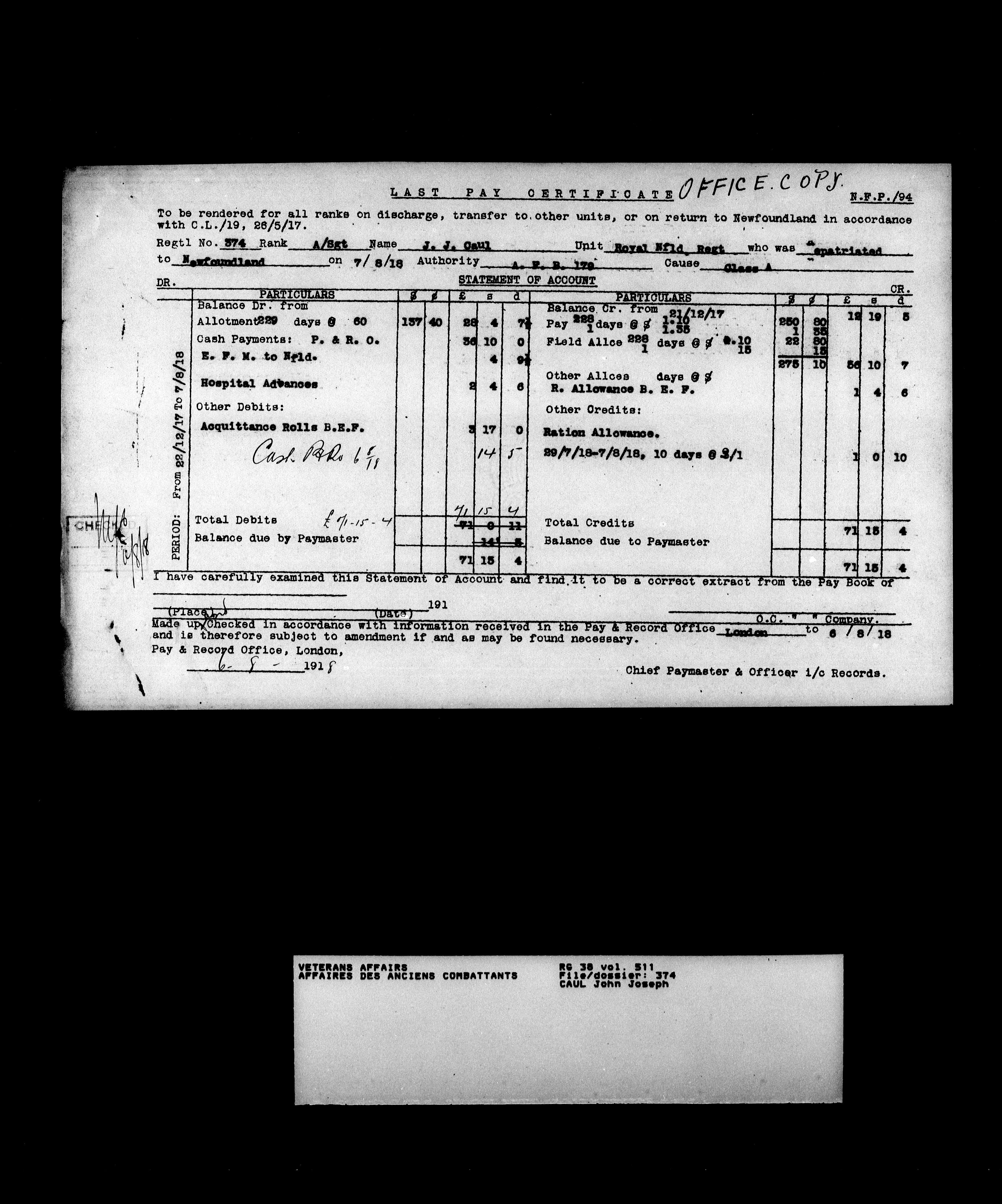 Military service files for members of the Royal Newfoundland Regiment and bandsmen and the Newfoundland Forestry Corps (1914-1919) - 18043