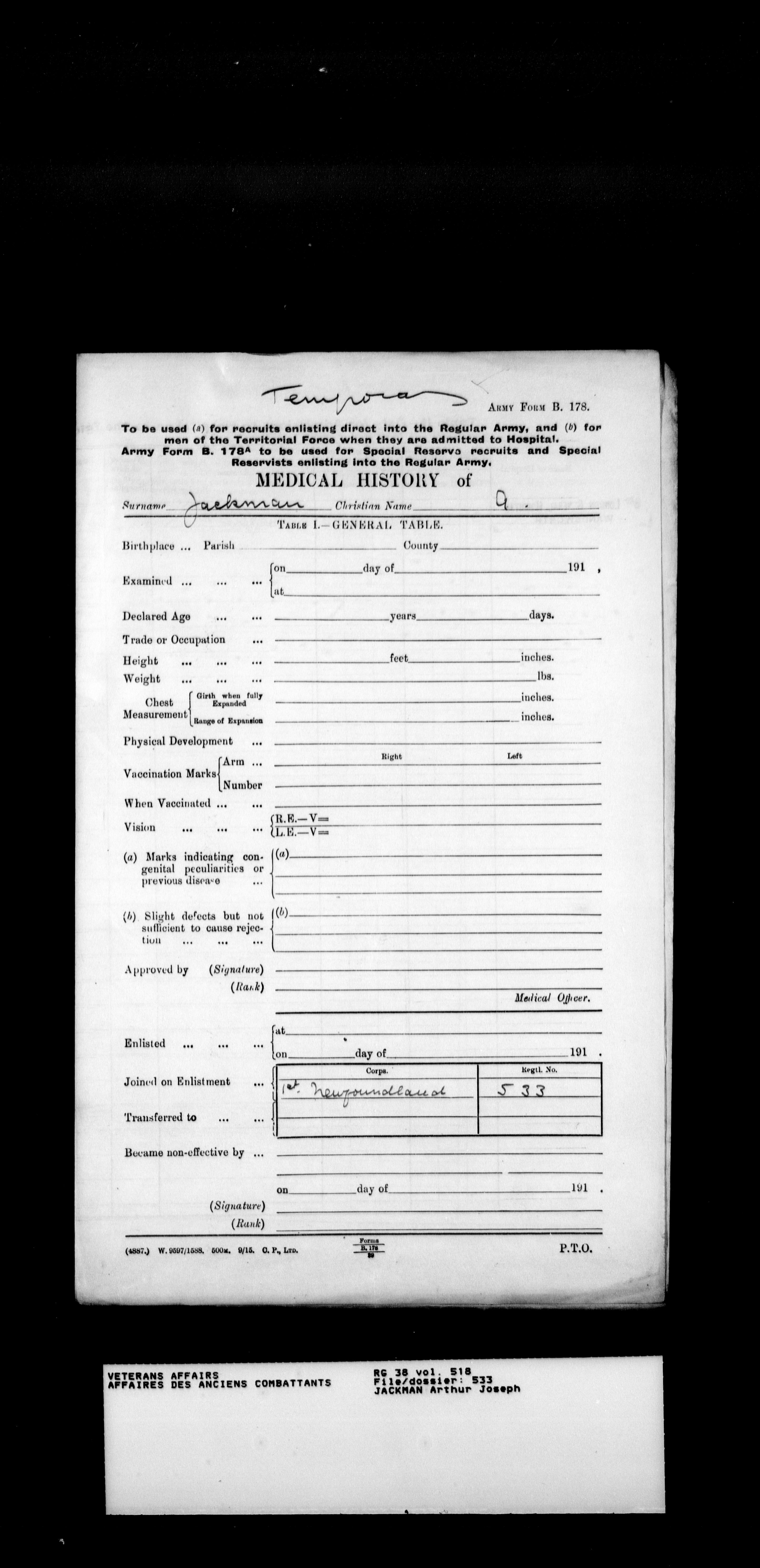 Military service files for members of the Royal Newfoundland Regiment and bandsmen and the Newfoundland Forestry Corps (1914-1919) - 18050