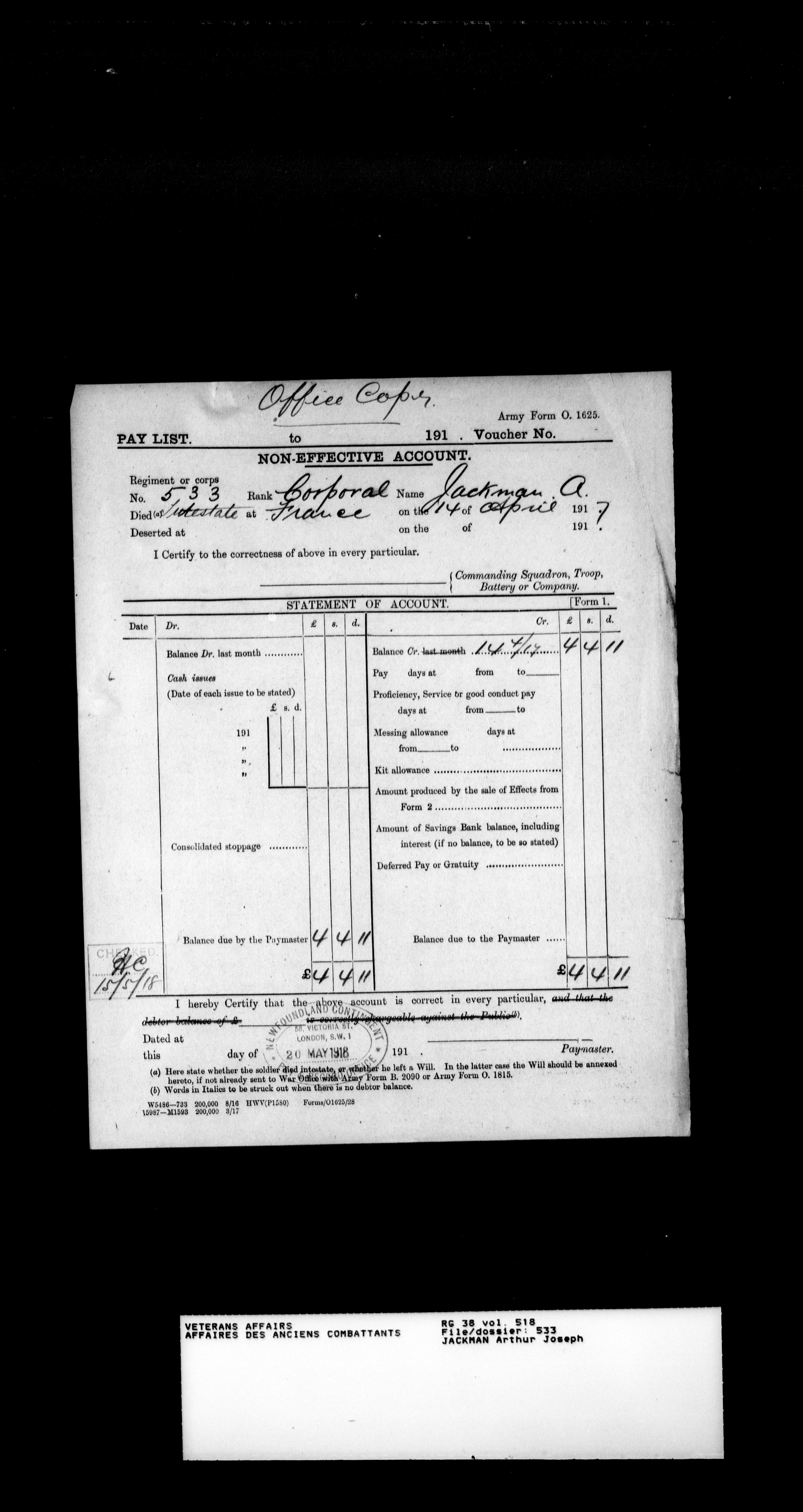 Military service files for members of the Royal Newfoundland Regiment and bandsmen and the Newfoundland Forestry Corps (1914-1919) - 18050