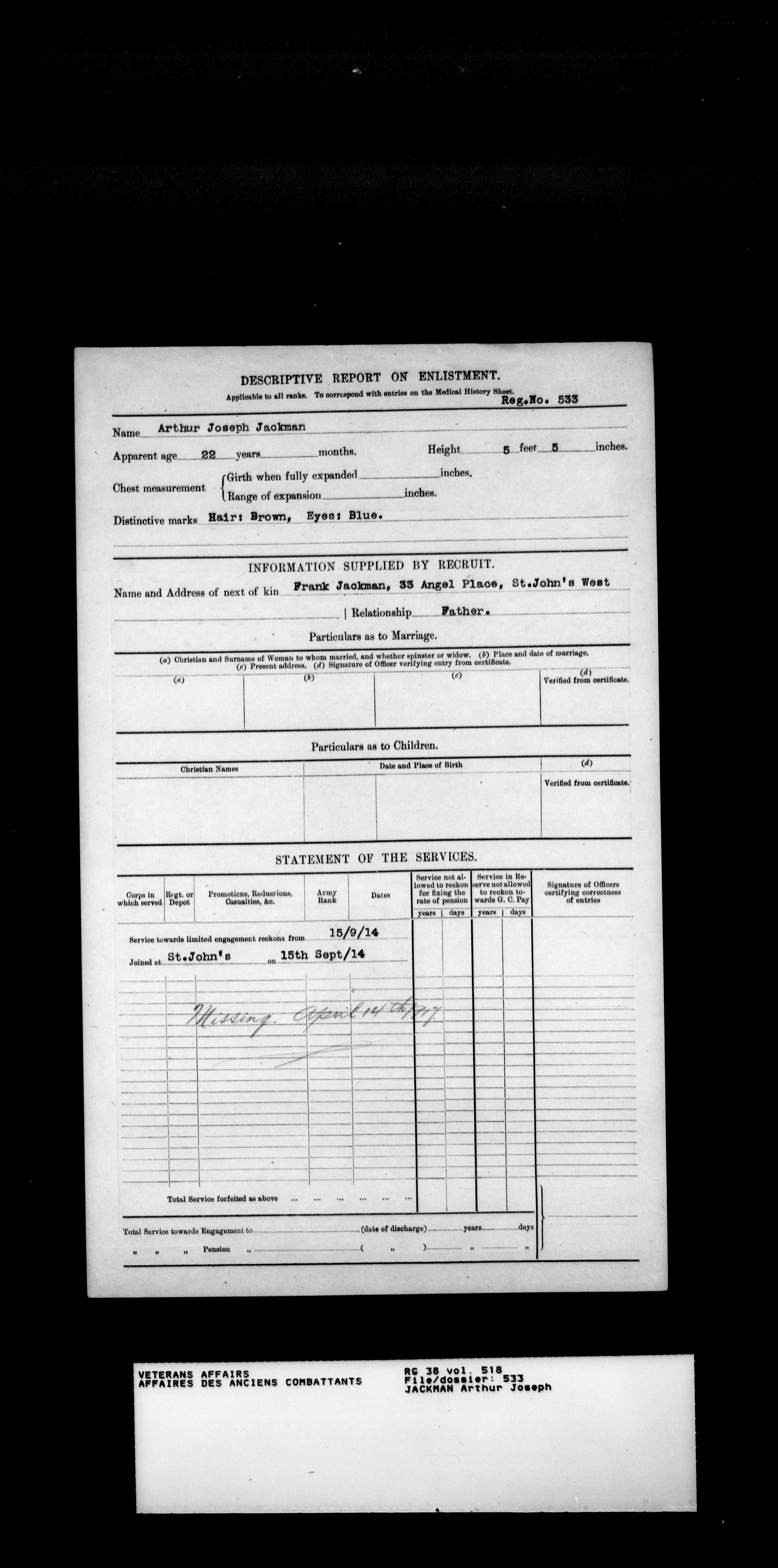Military service files for members of the Royal Newfoundland Regiment and bandsmen and the Newfoundland Forestry Corps (1914-1919) - 18050