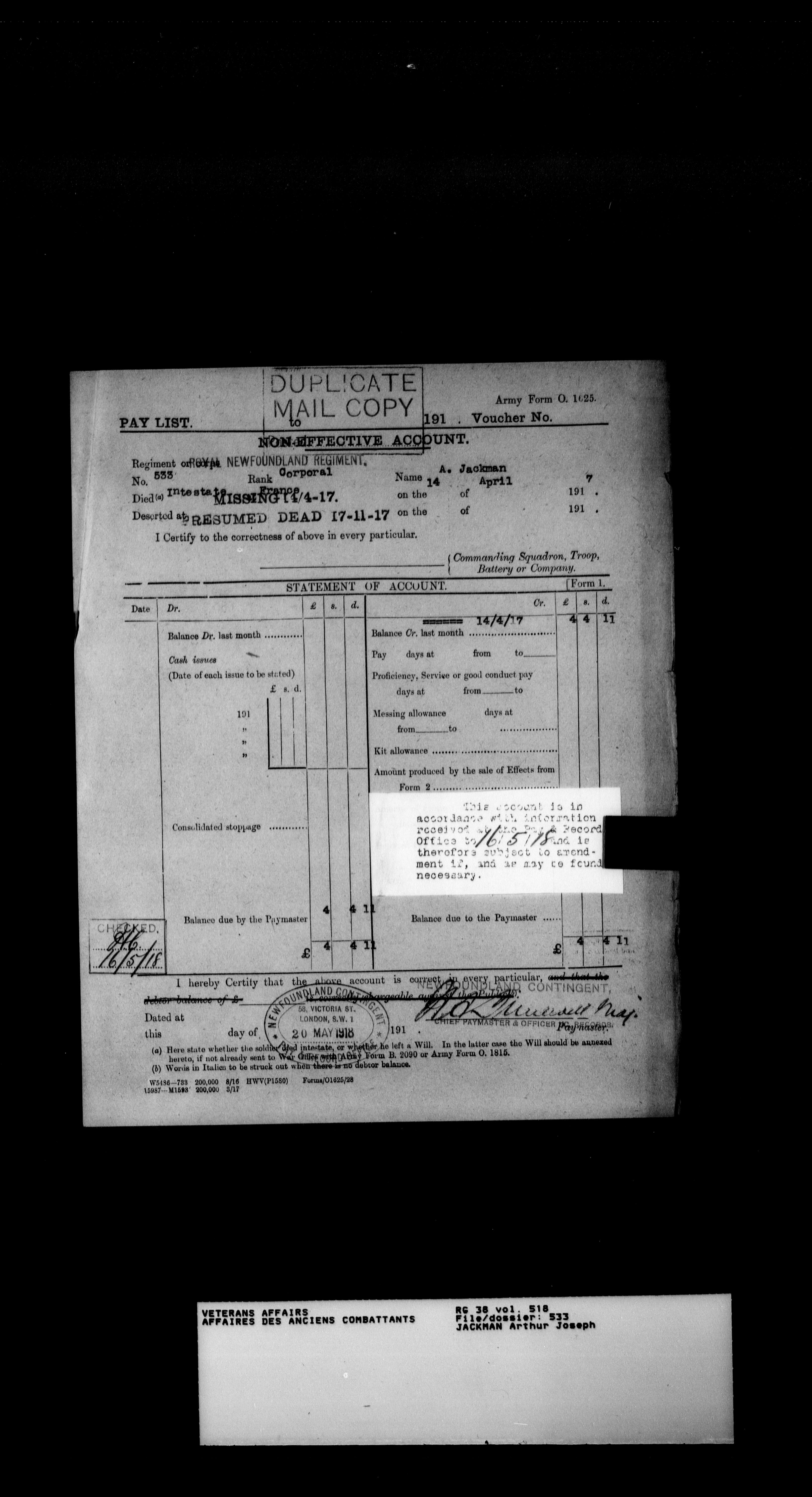 Military service files for members of the Royal Newfoundland Regiment and bandsmen and the Newfoundland Forestry Corps (1914-1919) - 18050