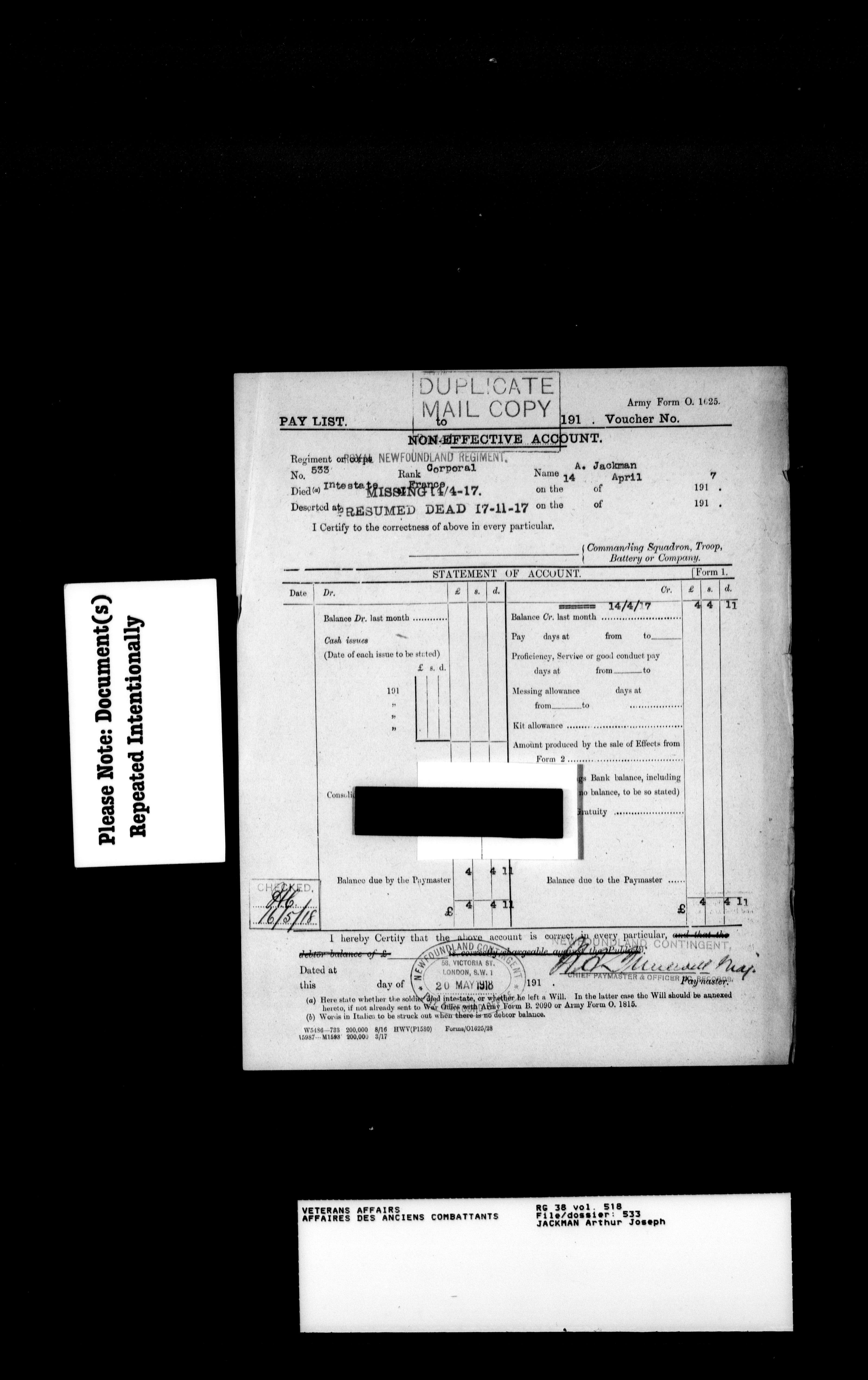 Military service files for members of the Royal Newfoundland Regiment and bandsmen and the Newfoundland Forestry Corps (1914-1919) - 18050