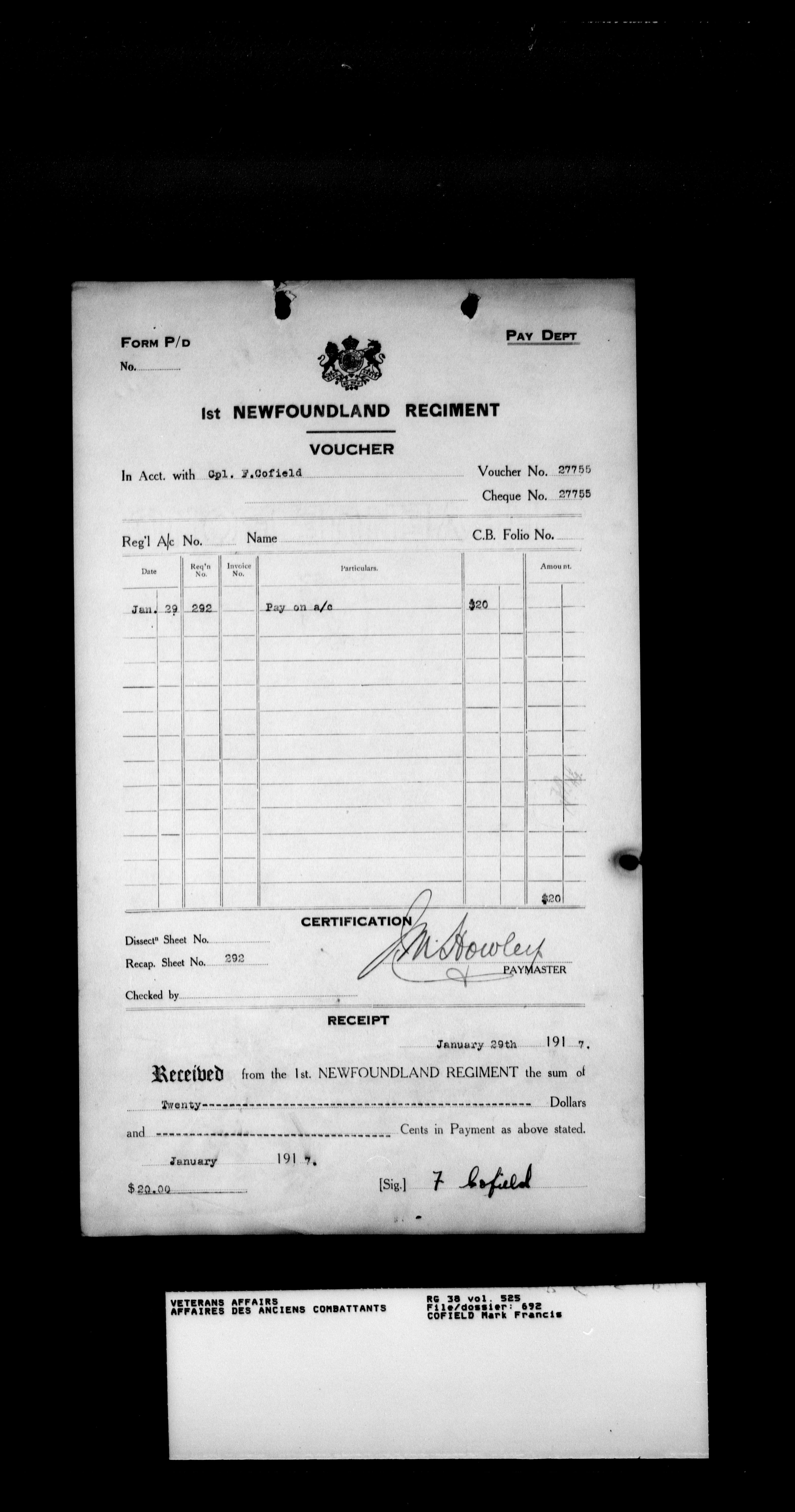 Military service files for members of the Royal Newfoundland Regiment and bandsmen and the Newfoundland Forestry Corps (1914-1919) - 18057