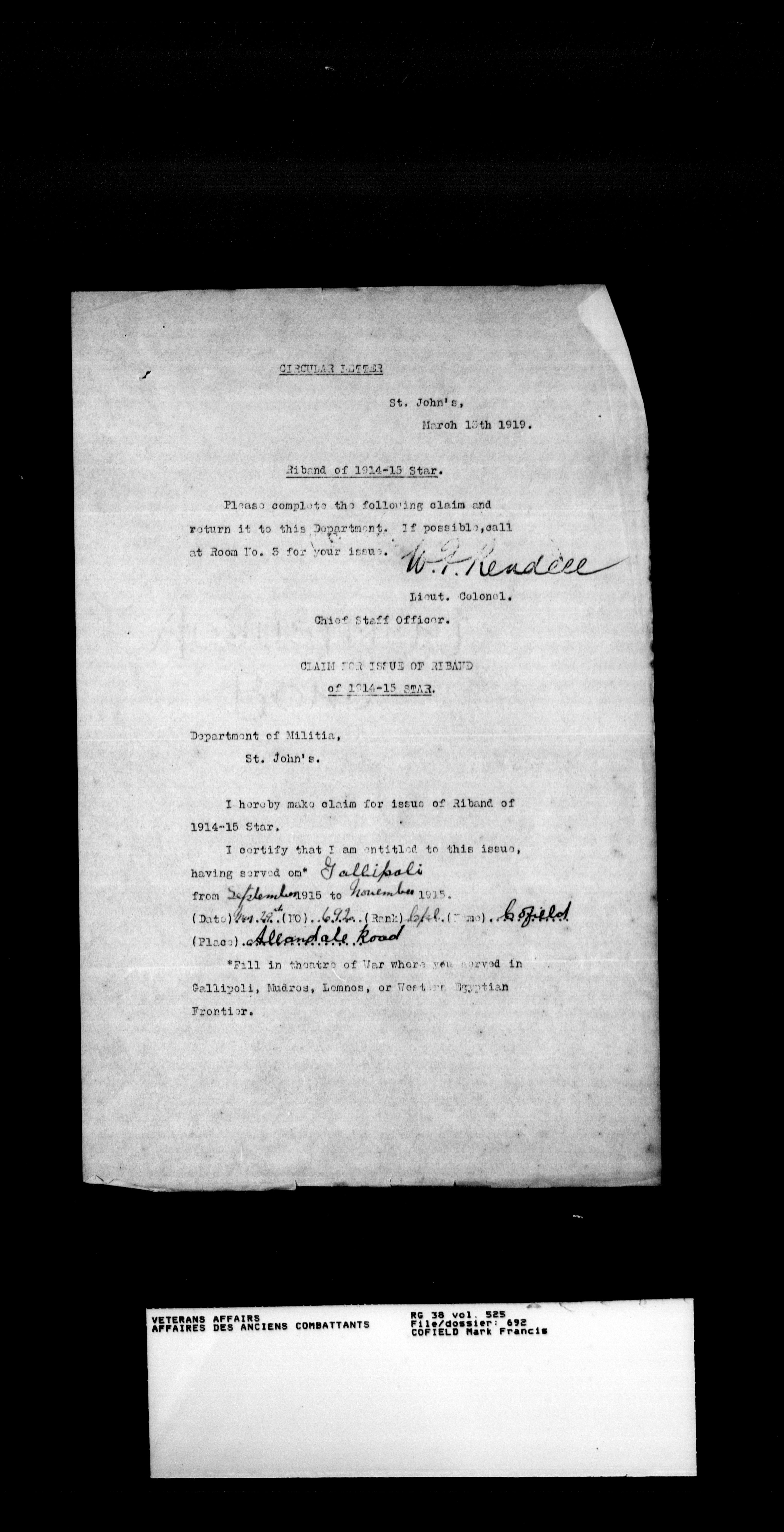 Military service files for members of the Royal Newfoundland Regiment and bandsmen and the Newfoundland Forestry Corps (1914-1919) - 18057