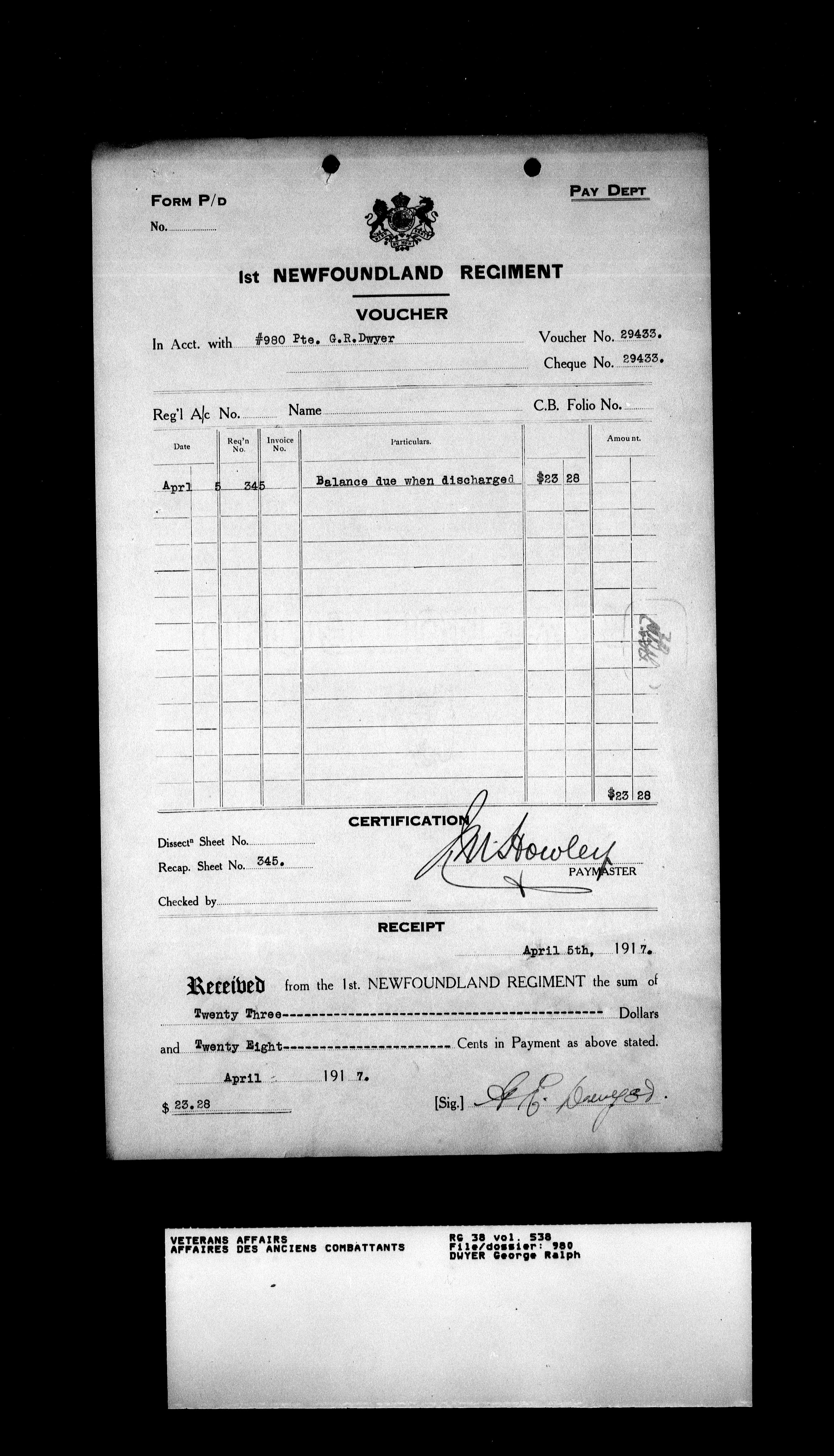 Military service files for members of the Royal Newfoundland Regiment and bandsmen and the Newfoundland Forestry Corps (1914-1919) - 18073