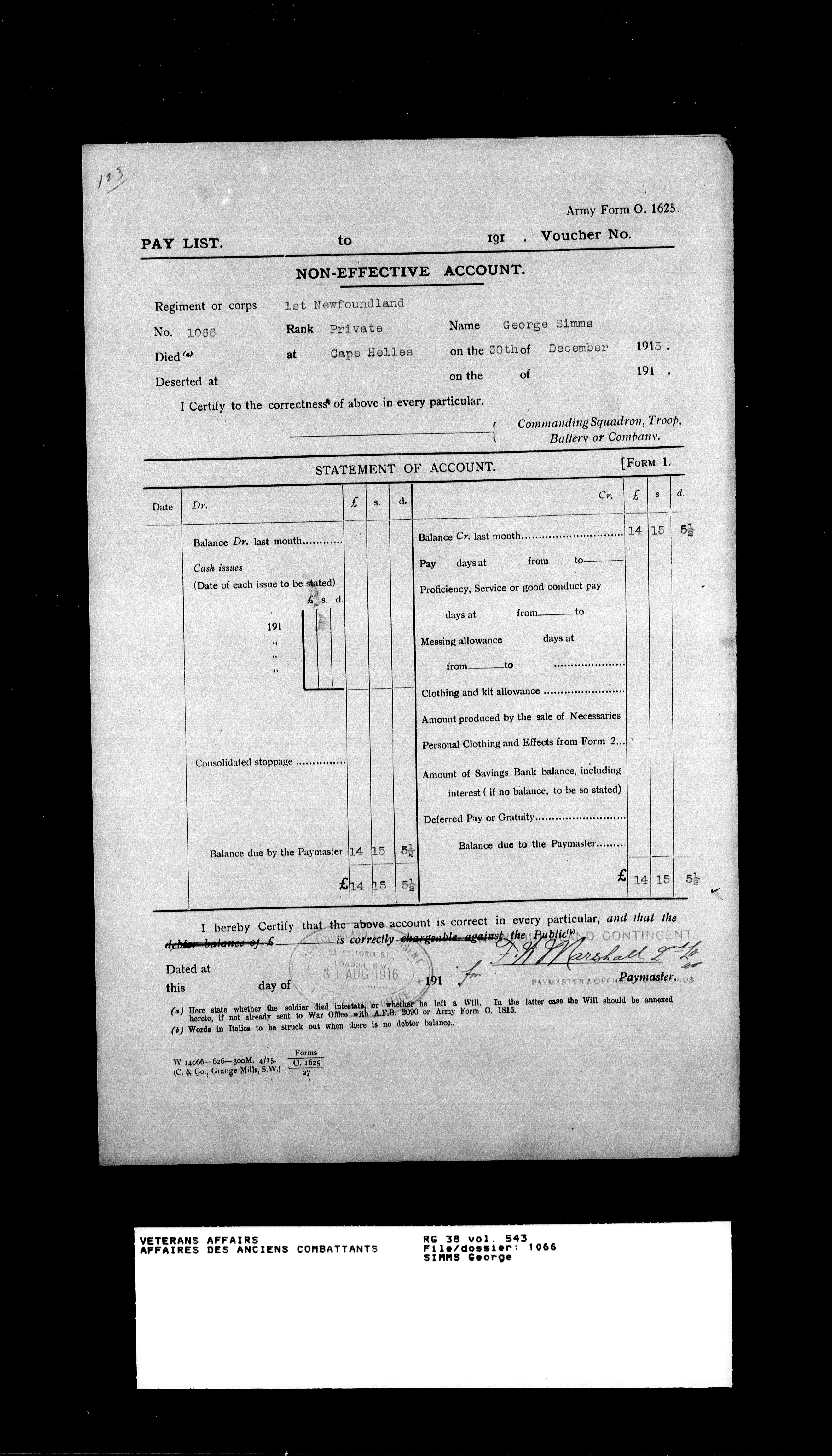 Military service files for members of the Royal Newfoundland Regiment and bandsmen and the Newfoundland Forestry Corps (1914-1919) - 18079