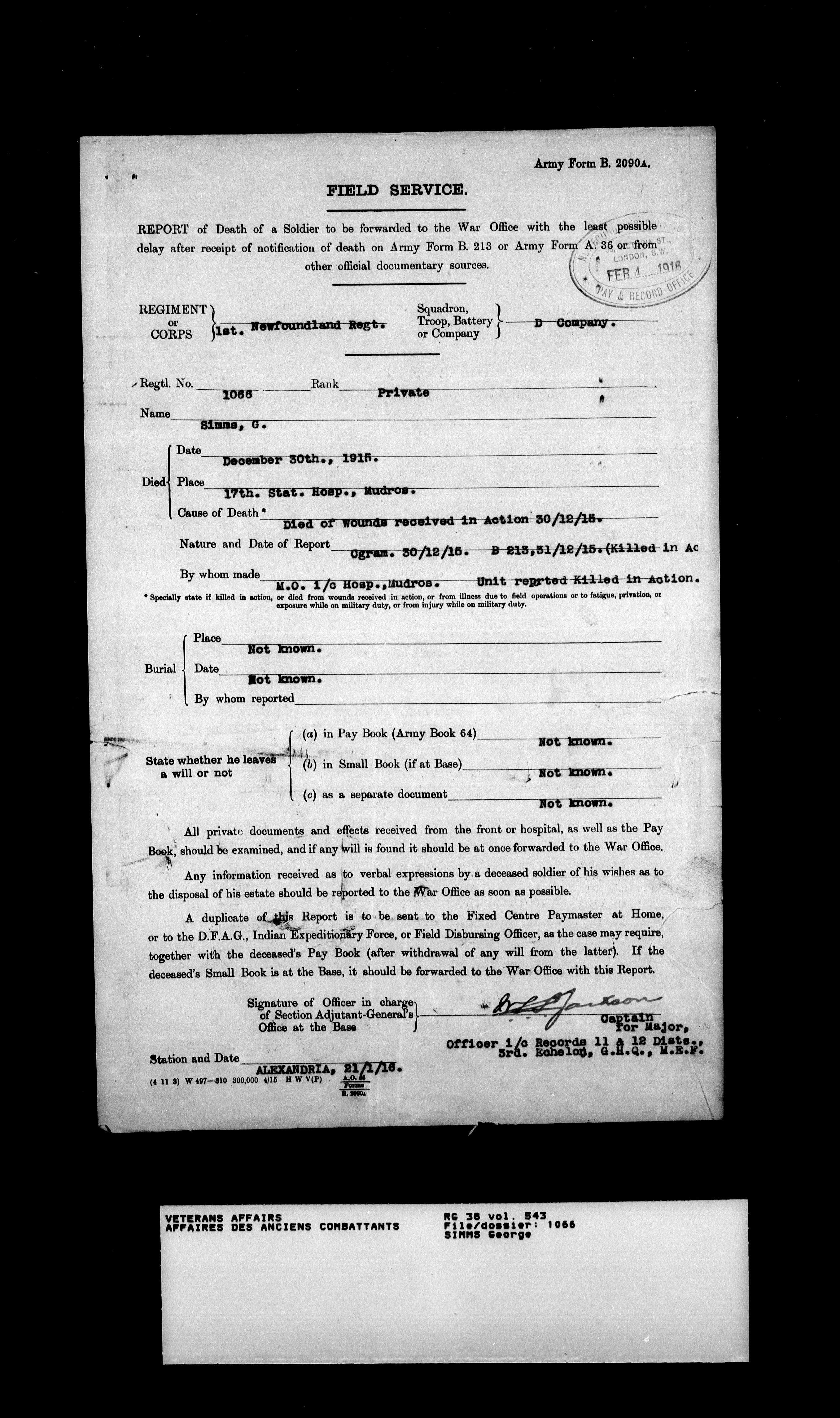 Military service files for members of the Royal Newfoundland Regiment and bandsmen and the Newfoundland Forestry Corps (1914-1919) - 18079