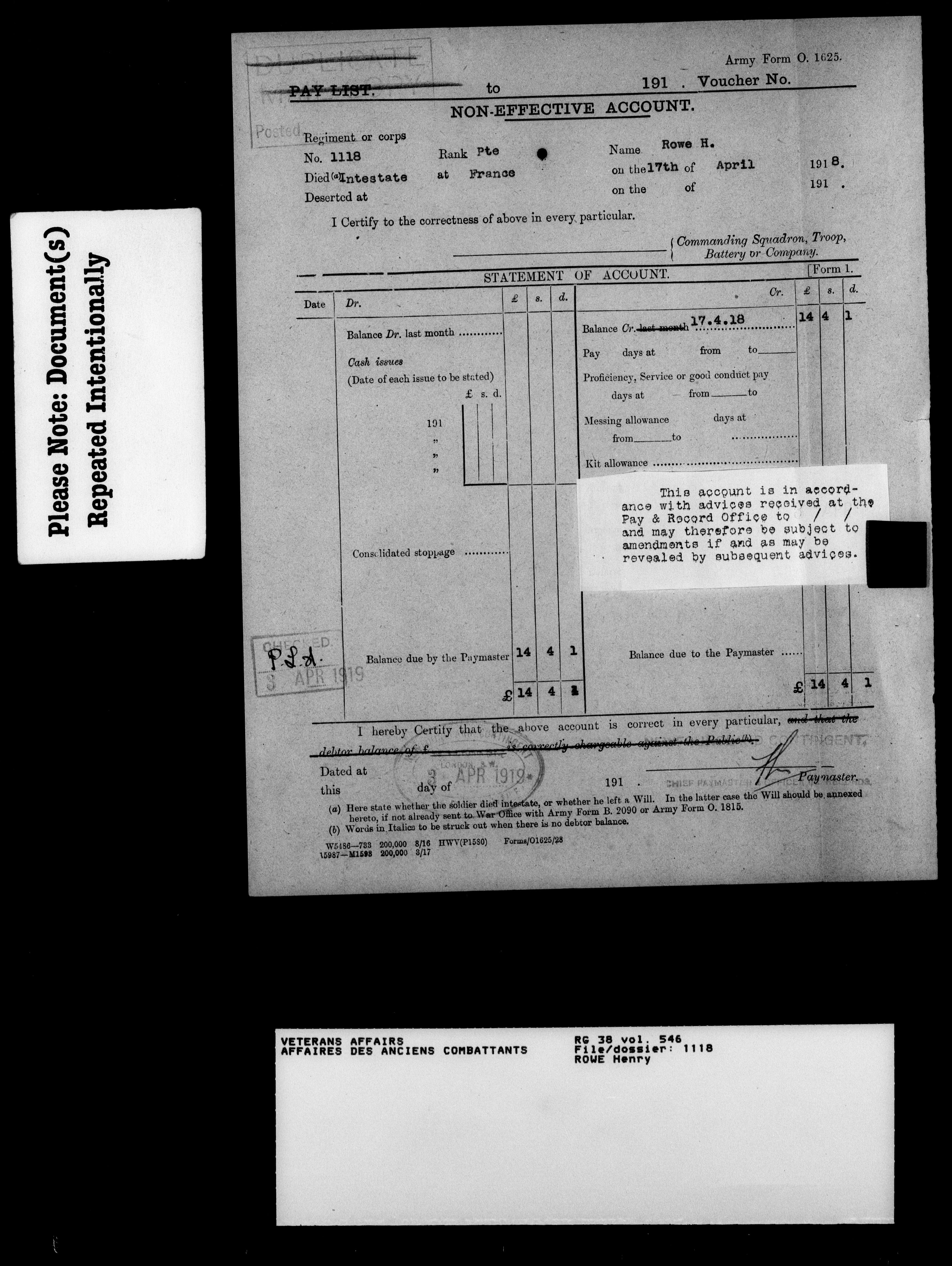 Military service files for members of the Royal Newfoundland Regiment and bandsmen and the Newfoundland Forestry Corps (1914-1919) - 18081