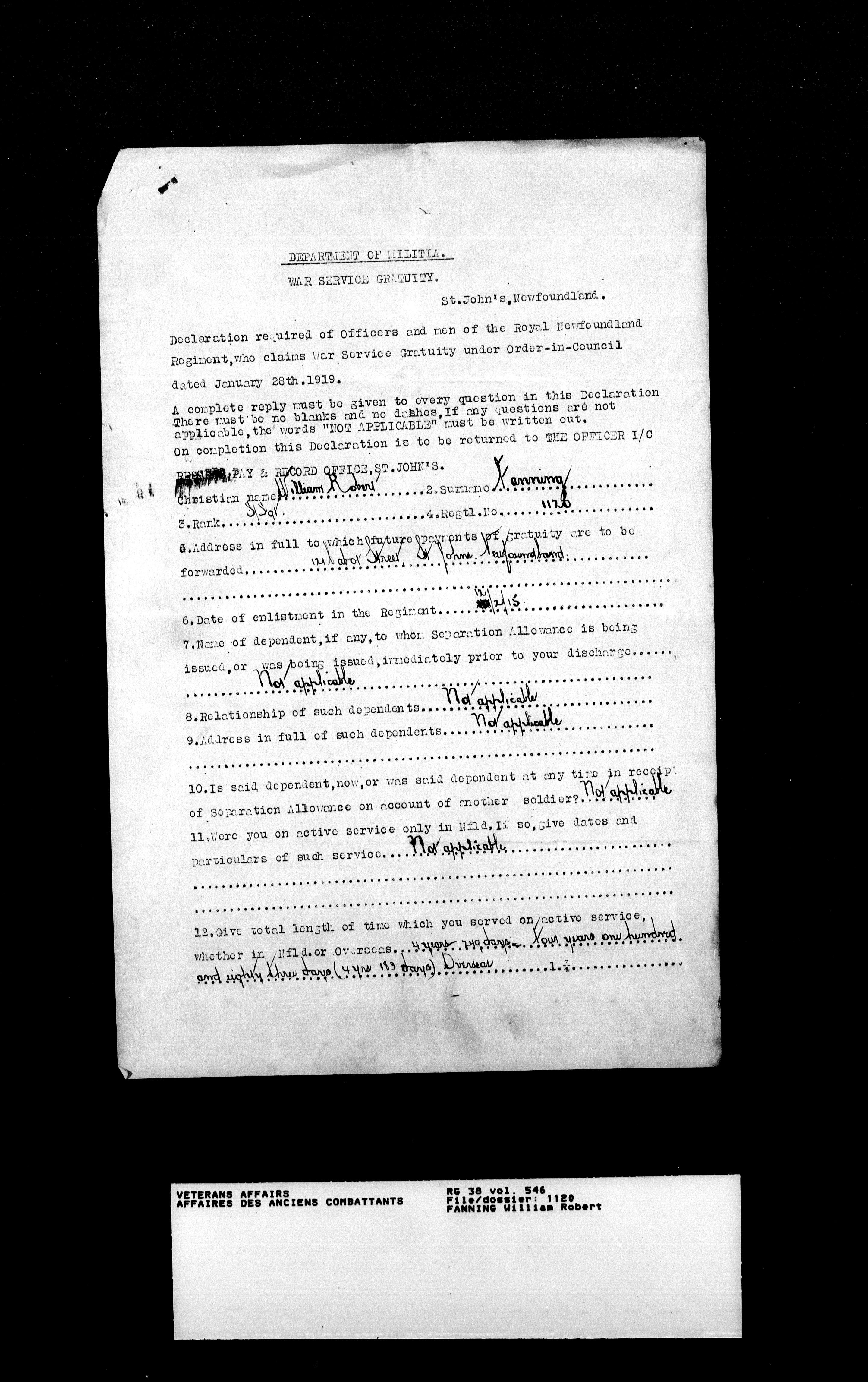 Military service files for members of the Royal Newfoundland Regiment and bandsmen and the Newfoundland Forestry Corps (1914-1919) - 18082