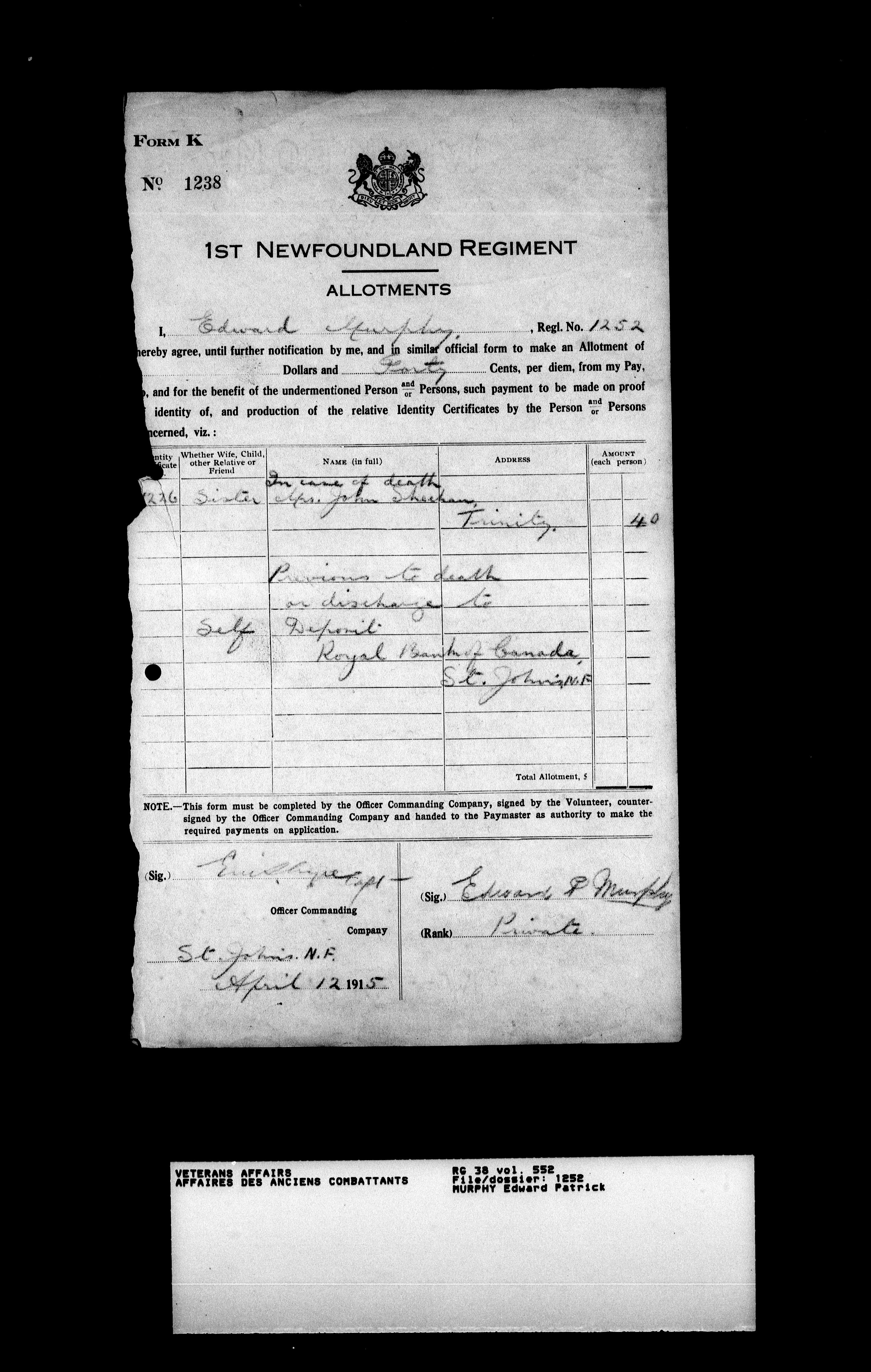 Military service files for members of the Royal Newfoundland Regiment and bandsmen and the Newfoundland Forestry Corps (1914-1919) - 18089