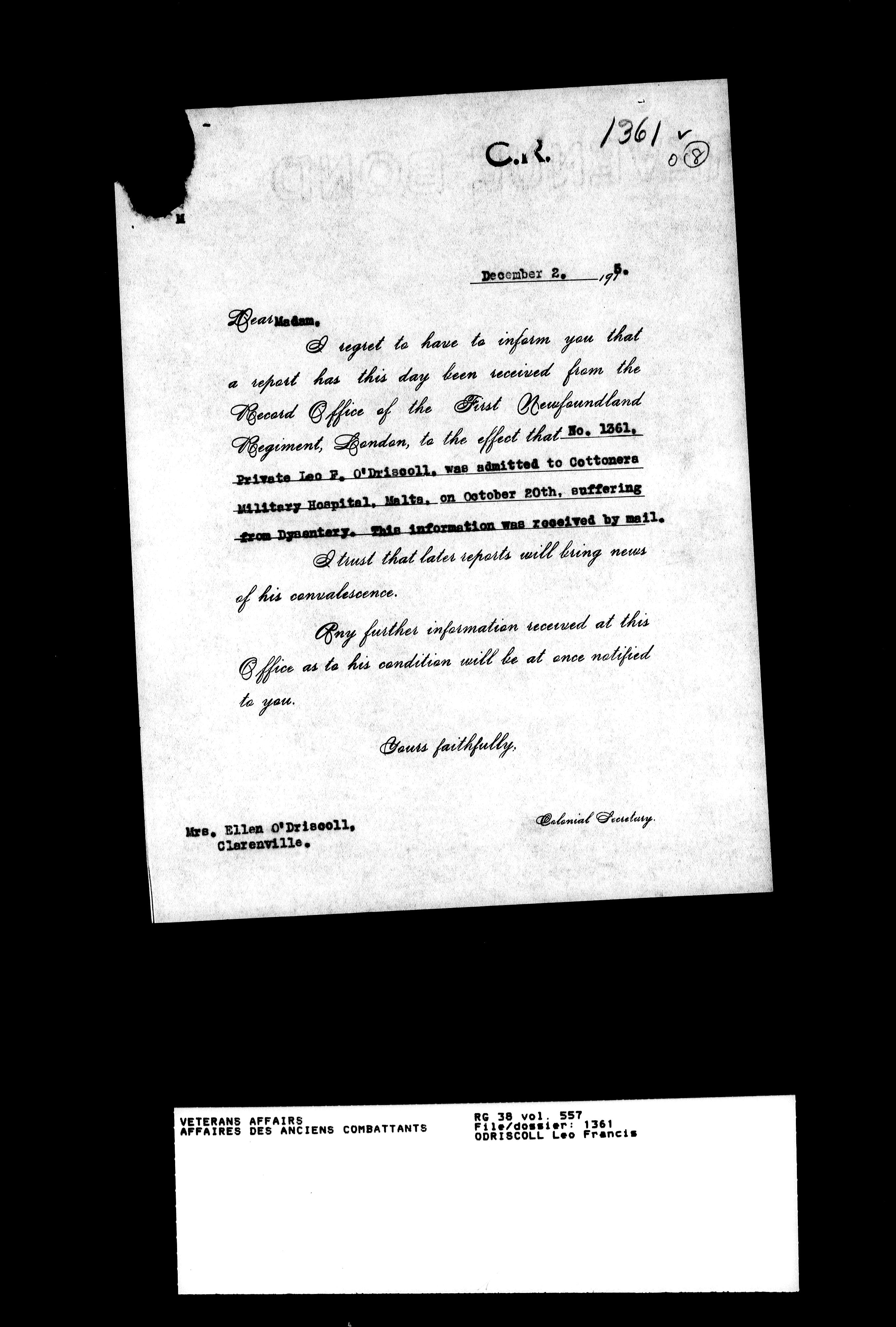 Military service files for members of the Royal Newfoundland Regiment and bandsmen and the Newfoundland Forestry Corps (1914-1919) - 18094