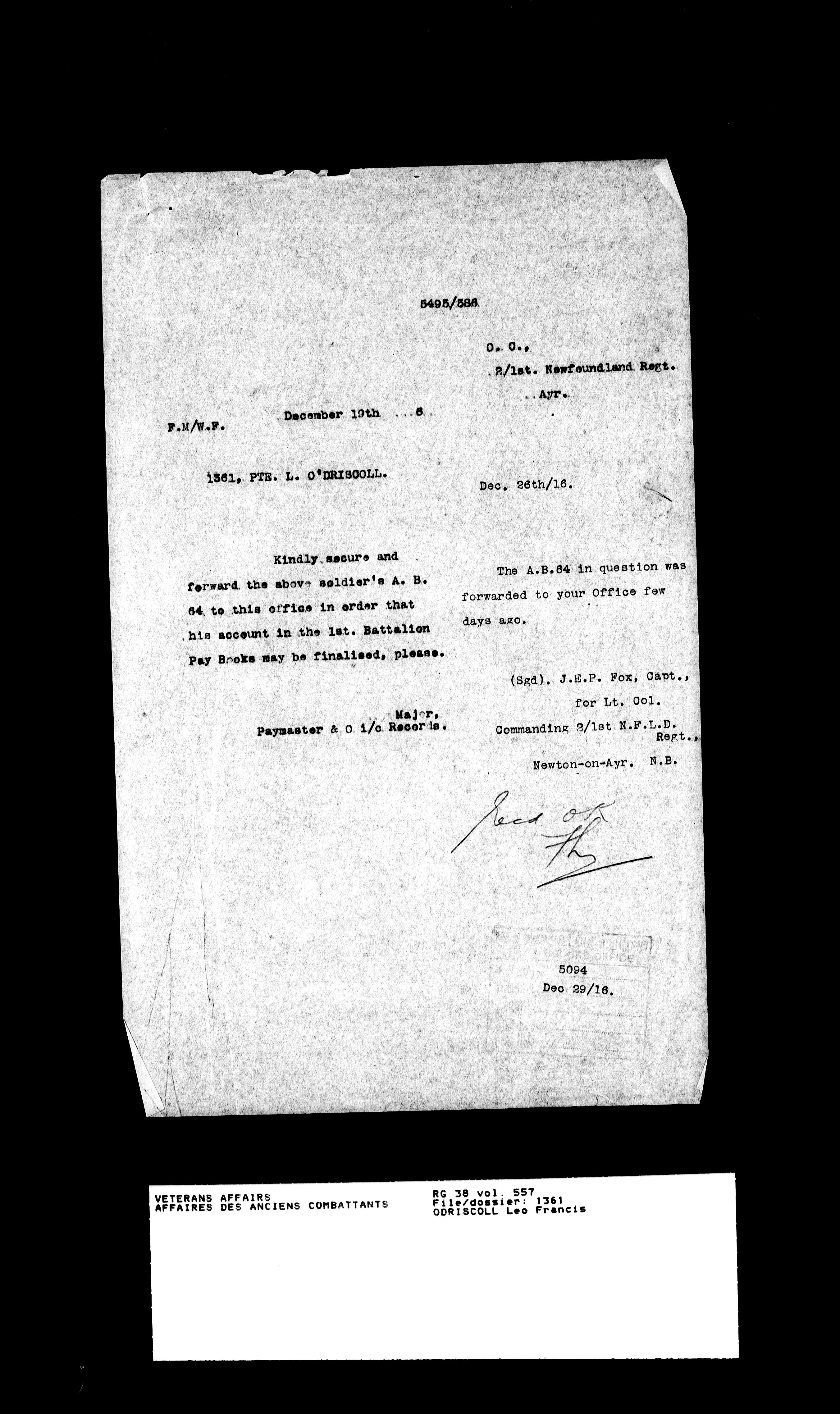 Military service files for members of the Royal Newfoundland Regiment and bandsmen and the Newfoundland Forestry Corps (1914-1919) - 18094