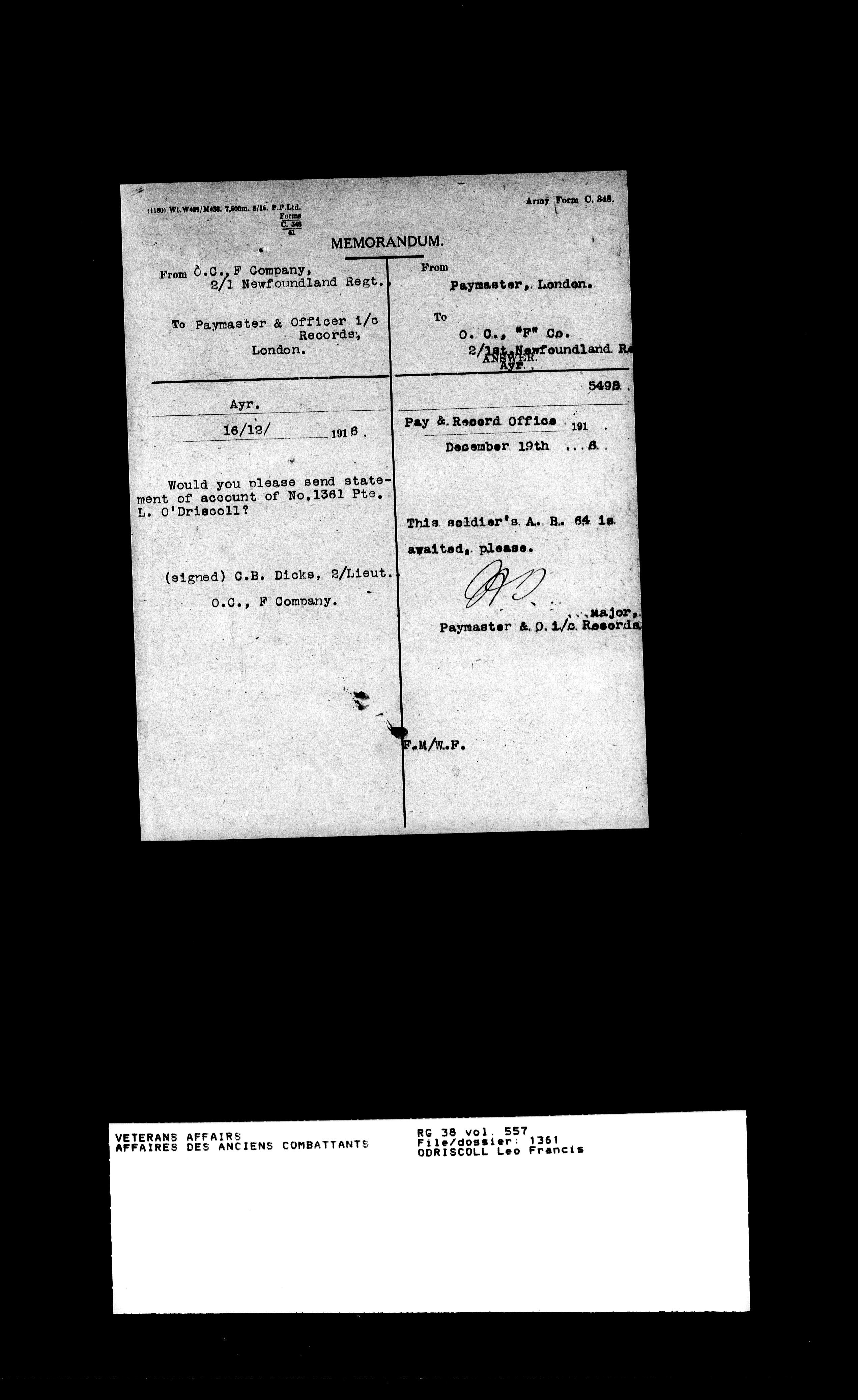 Military service files for members of the Royal Newfoundland Regiment and bandsmen and the Newfoundland Forestry Corps (1914-1919) - 18094