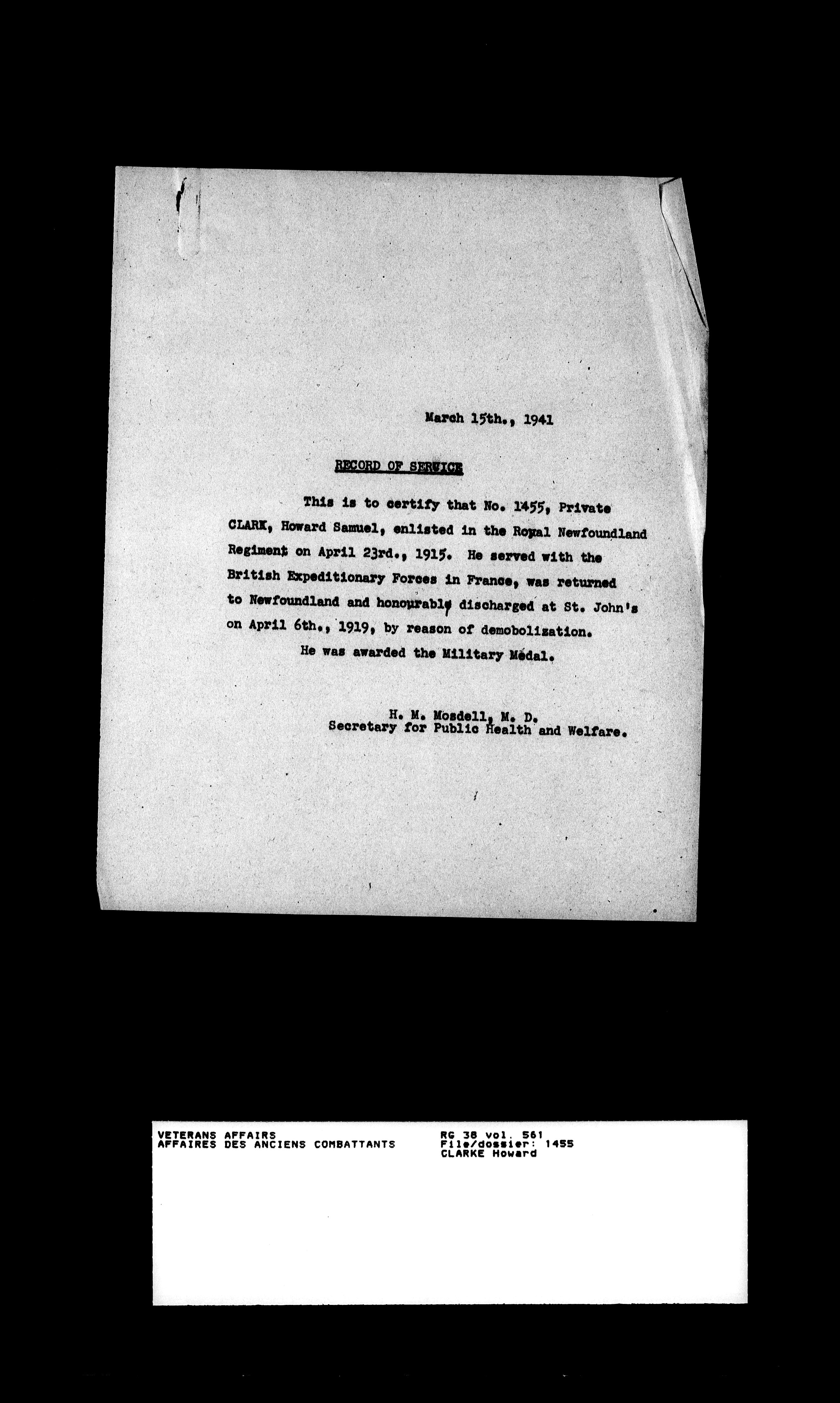 Military service files for members of the Royal Newfoundland Regiment and bandsmen and the Newfoundland Forestry Corps (1914-1919) - 18099